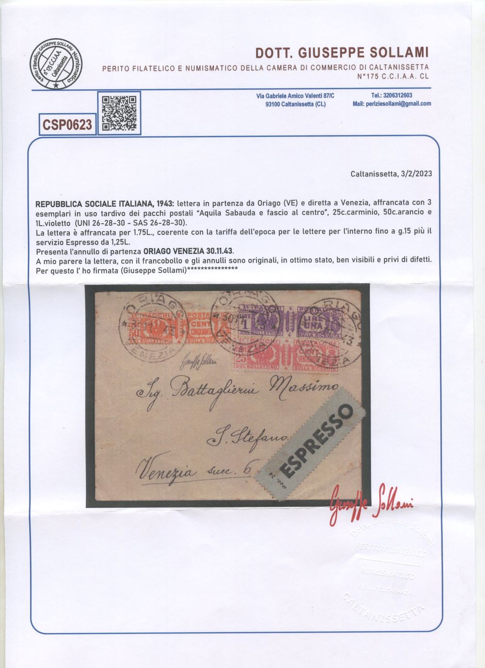 1943 - Busta da Oriago per Venezia affrancata per 1,75 Lire tramite i francobolli per pacchi n. 26, 28, 30. Cert. Sollami.