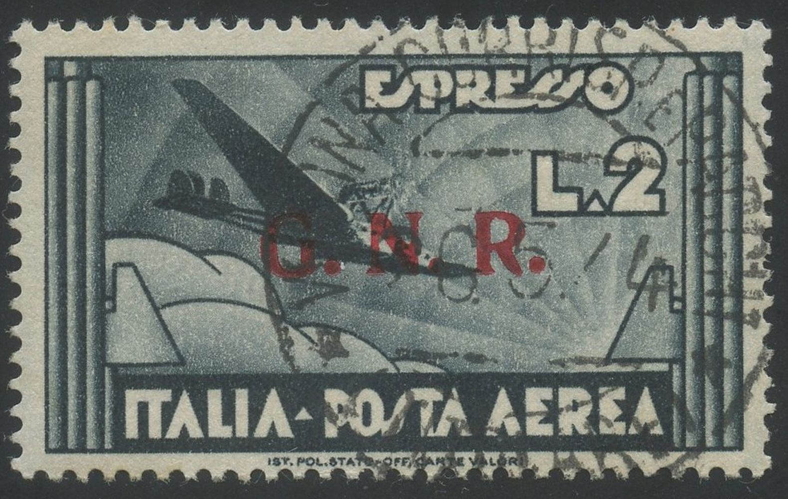 1944 - 2 Lire Ardesia n.125 (Espresso n.73) con soprastampa G.N.R. tiratura di Verona, usato con l'annullo ''TITOLARE'' molto ben leggibile.