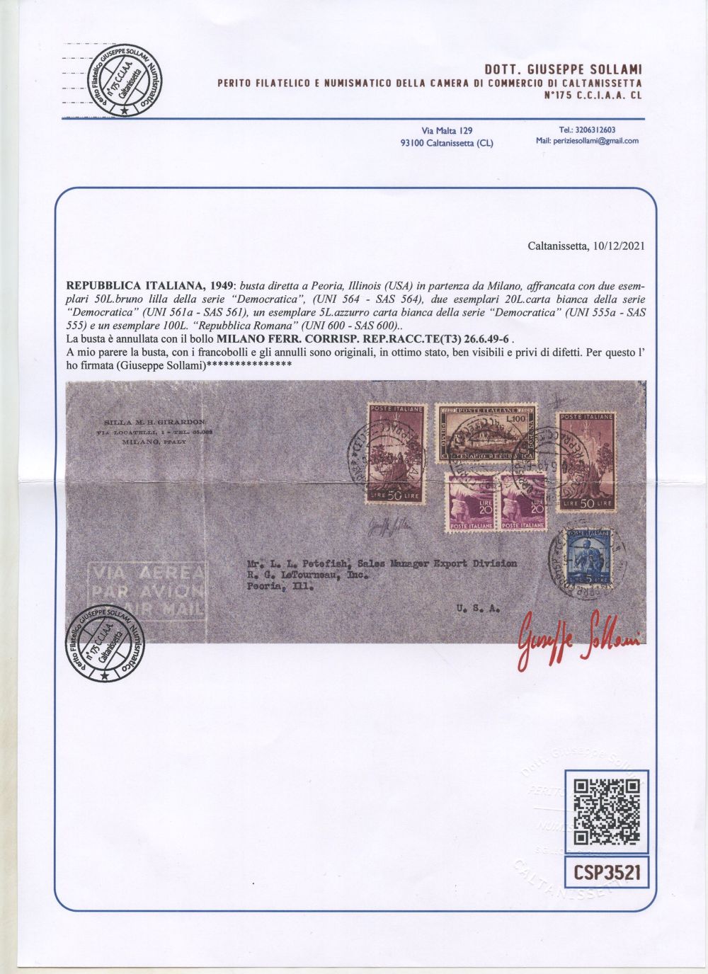 28.06.1949 - Busta spedita da Milano per Peoria (Illinois) ed affrancata tramite 100 L. Repubblica Romana più altri valori complementari della serie Democratica per un totale di 245 Lire. Cert. Sollami.