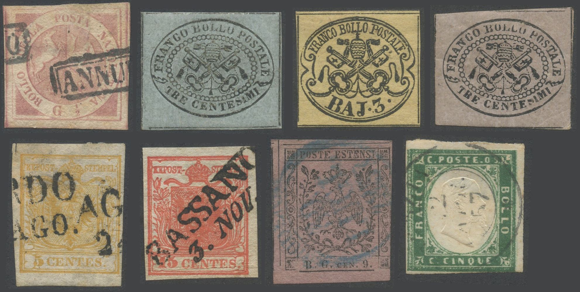 Interessante selezione del periodo con discrete presenze. N.B. Il 3 cent. grigio è una ristampa privata. Qualità mista.