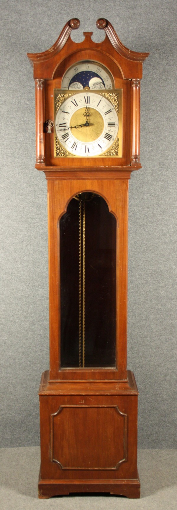 Orologio a torre in legno di mogano con meccanismo a fasi lunari. XX secolo. Difetti. Mis. Lung. cm. 50 Alt. cm. 210 Prof. cm. 30 ca.