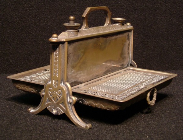 Scaldavivande da viaggio a forma di borsetta in metallo argentato. Mis. Lung. cm. 18 Alt. cm. 13 Prof. cm. 10 ca.