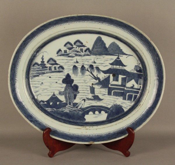 Piatto da portata in porcellana bianca e blu. Cina, dinastia Qing (Qianlong, 1736-1790). Lievi difetti. Mis. Lung. cm. 46 Prof. cm. 38 ca.