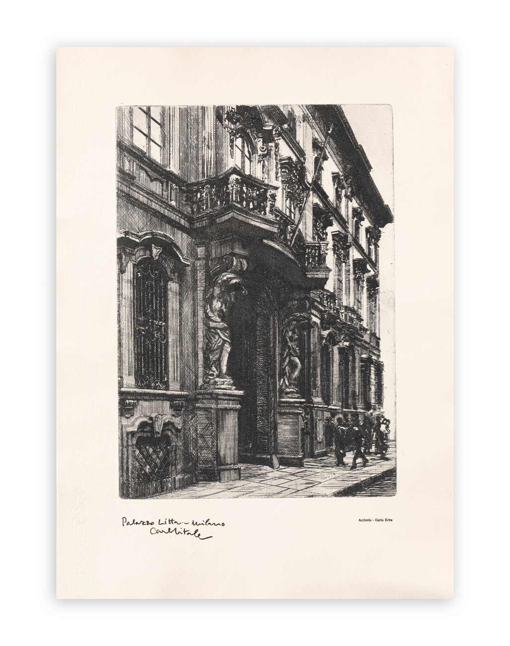 Raccolta di 8 tavole incise di Carlo Vitale raffiguranti scorci di Milano: