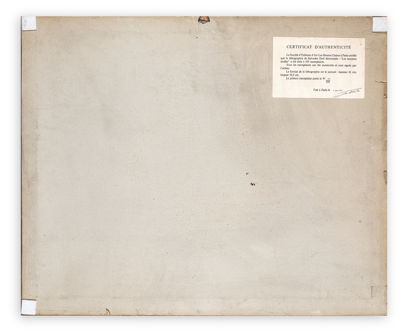 Certificato di autenticità recante caratteristiche tecniche, numerazione e datazione (1975) a cura dell'Editore Les Heures Claires (PARIGI) al retro