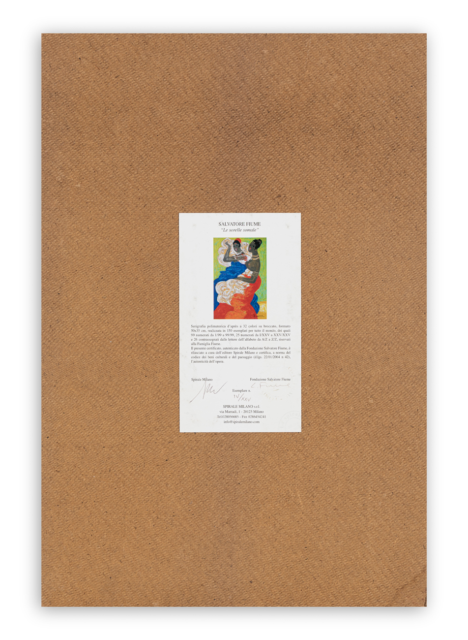 Certificato autenticità dalla Fondazione Fiume e rilasciato dall'Editore Spirale (MI) al retro con timbri della Fondazione Fiume e dell'Editore Spirale (MI)