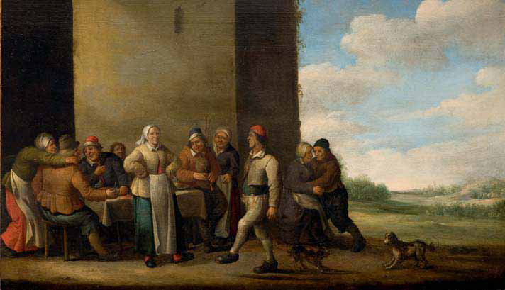 Joost Cornelisz Droochsloot Utrecht 1585/86 – 1666 CONVITO DI PAESANI olio su tavola, cm 44x72. Firmato e datato sulla parete al centro: J. C. Dr…c..sloot 1658 Si veda per confronto il dipinto (olio su tavola, cm 58x94) conservato presso la Galleria Estense di Modena (cat. 1945, n. 589). Per l’opera è stato richiesto l’Attestato di Libera Circolazione.