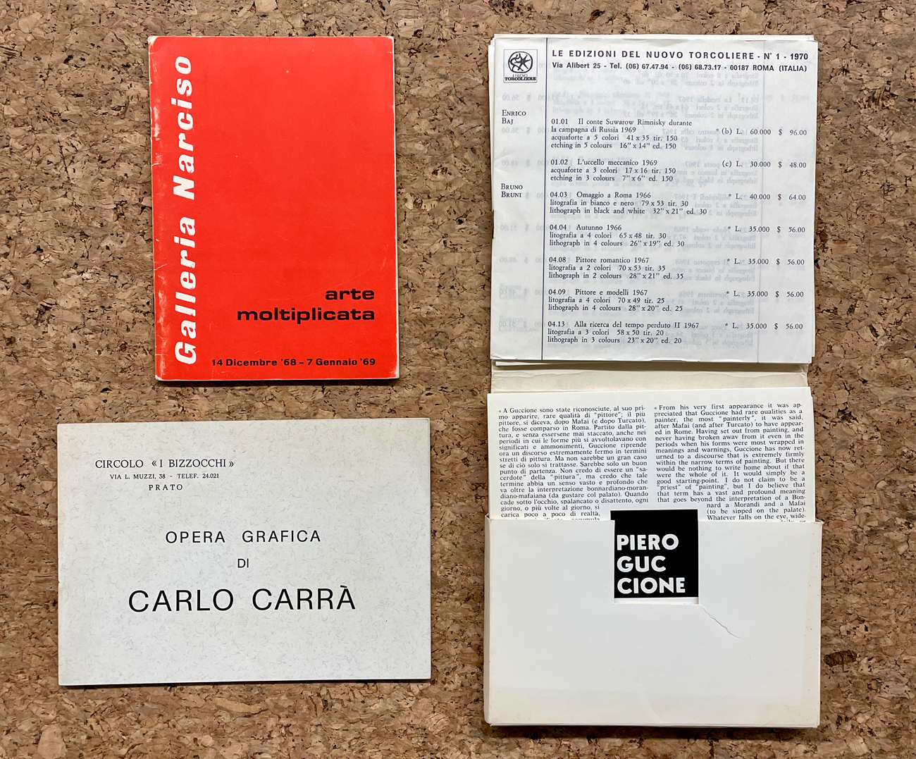 - Le edizioni del Nuovo Torcoliere, Roma (cofanetto con schede sciolte con opere di Bruno Bruni, Piero Guccione, Paolo Rubini, Attilio Steffanoni, Renzo Vespignani, Sergio Saroni, Franco Gentilini, Gino Guida, Nino Cordio, Mario Ceroli, Titina Maselli e Renato Guttuso)
