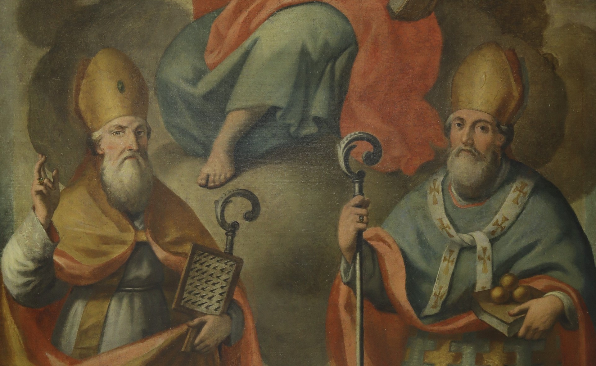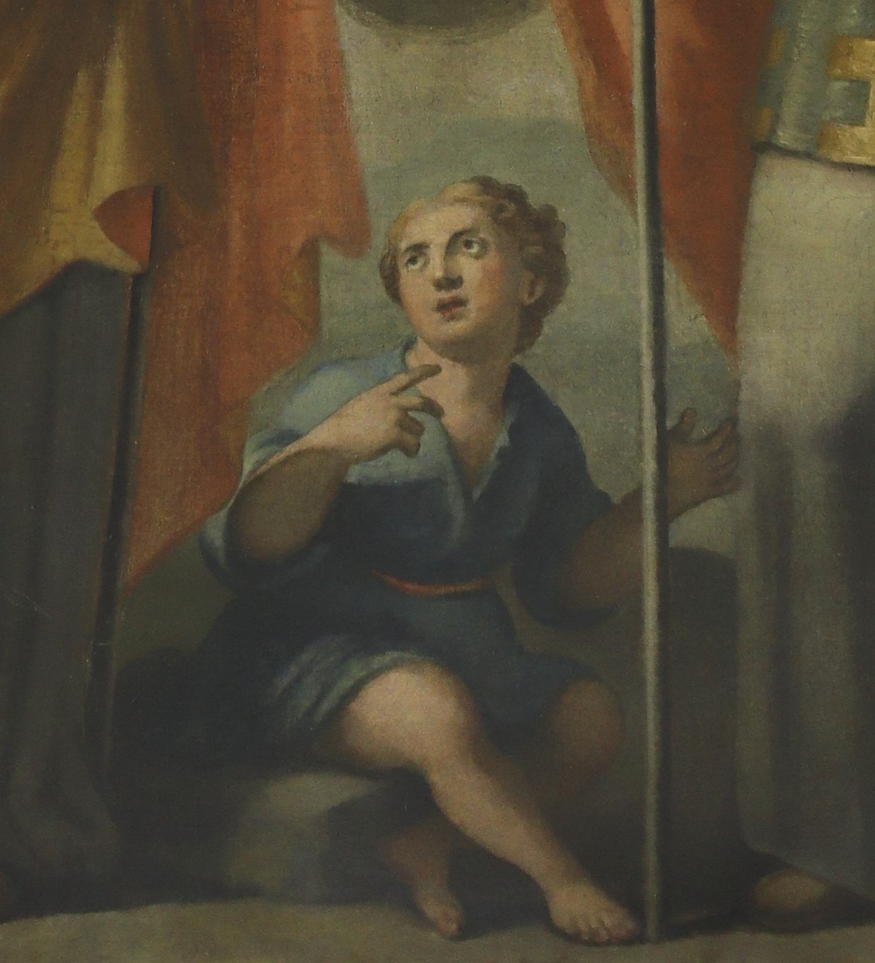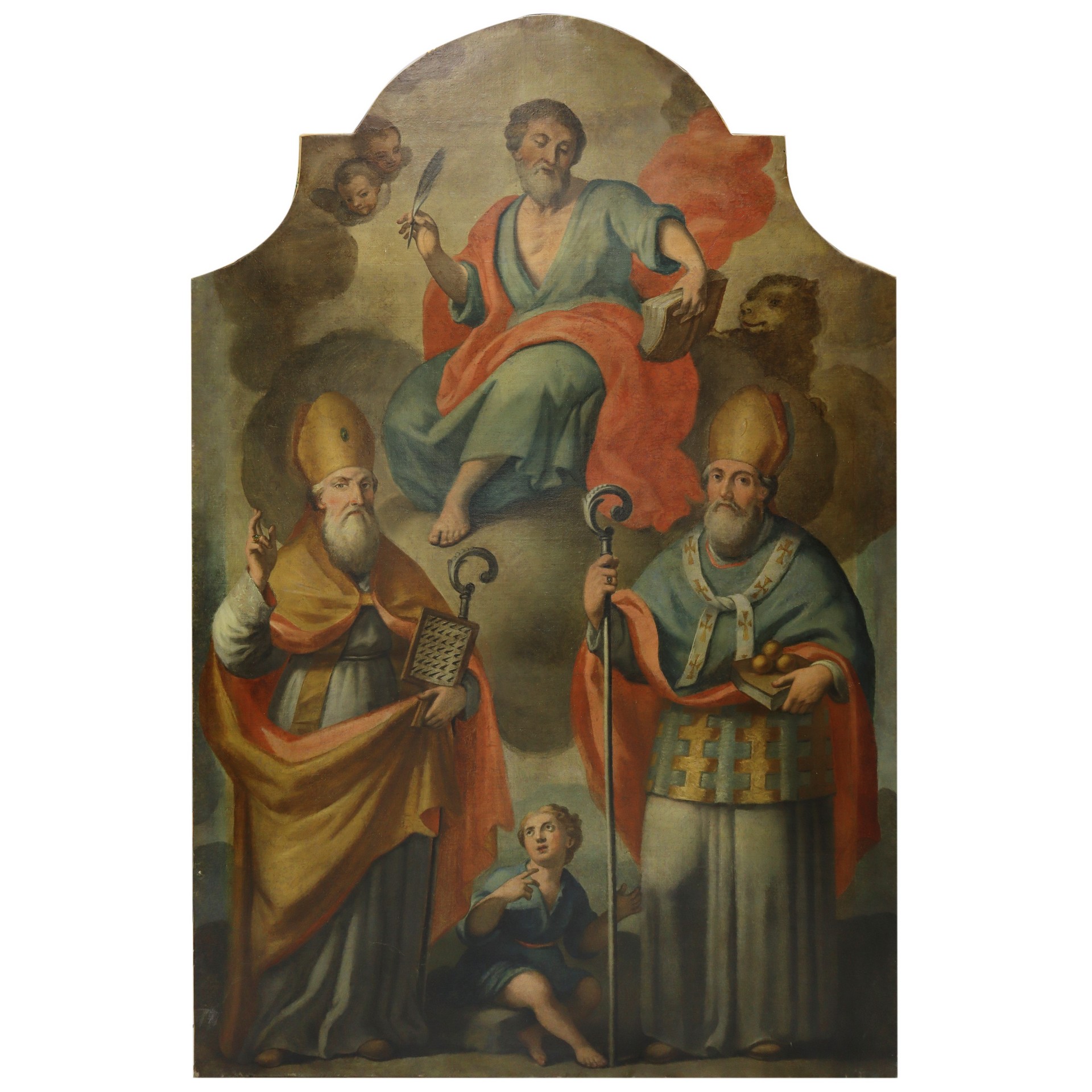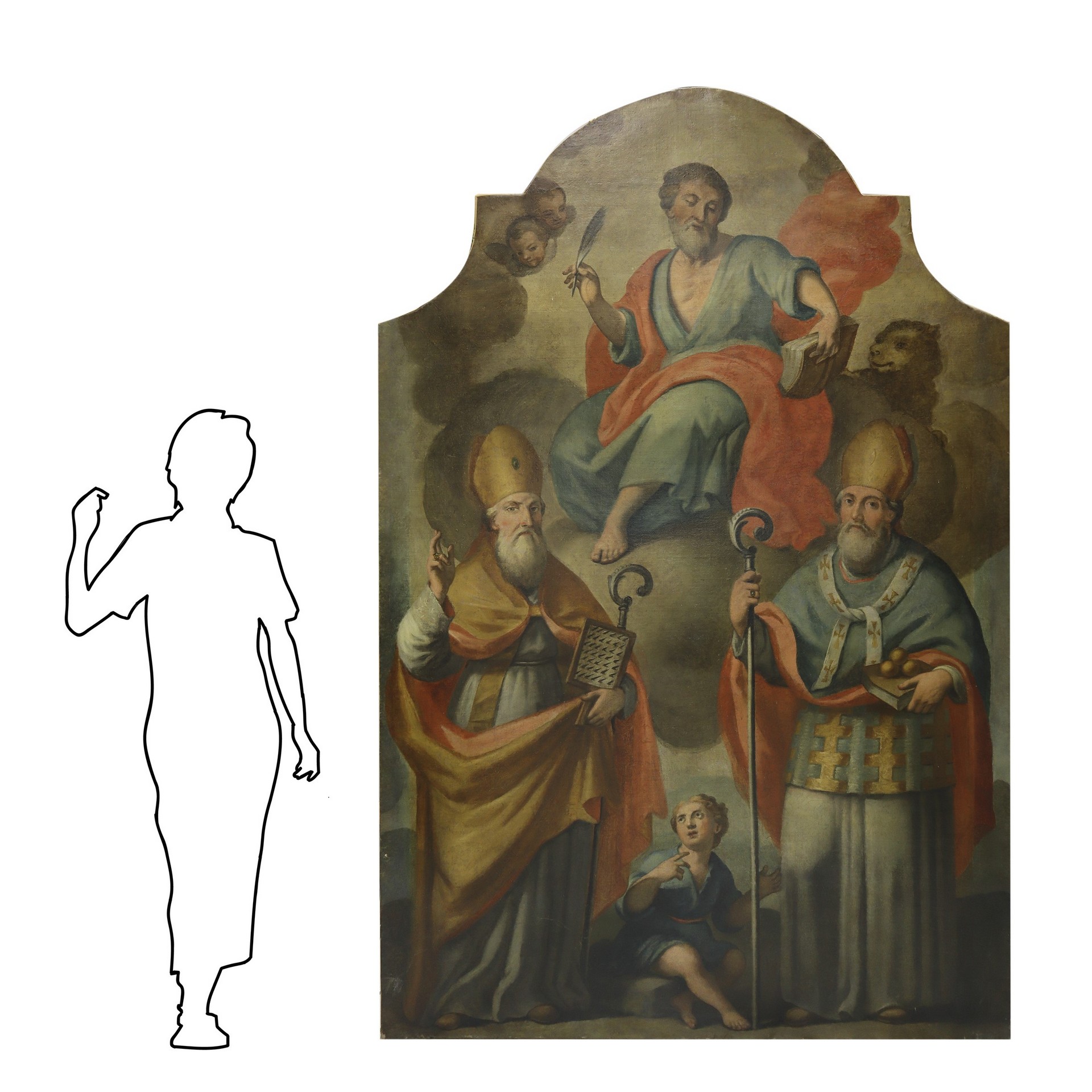 San Marco Evangelista con Santi Vescovi H cm 200x131 Pittore italiano della fine del XVII secolo. Telaio centinato. Cadute di colore.Pittore italiano della fine del XVII secolo. Telaio centinato. Cadute di colore.