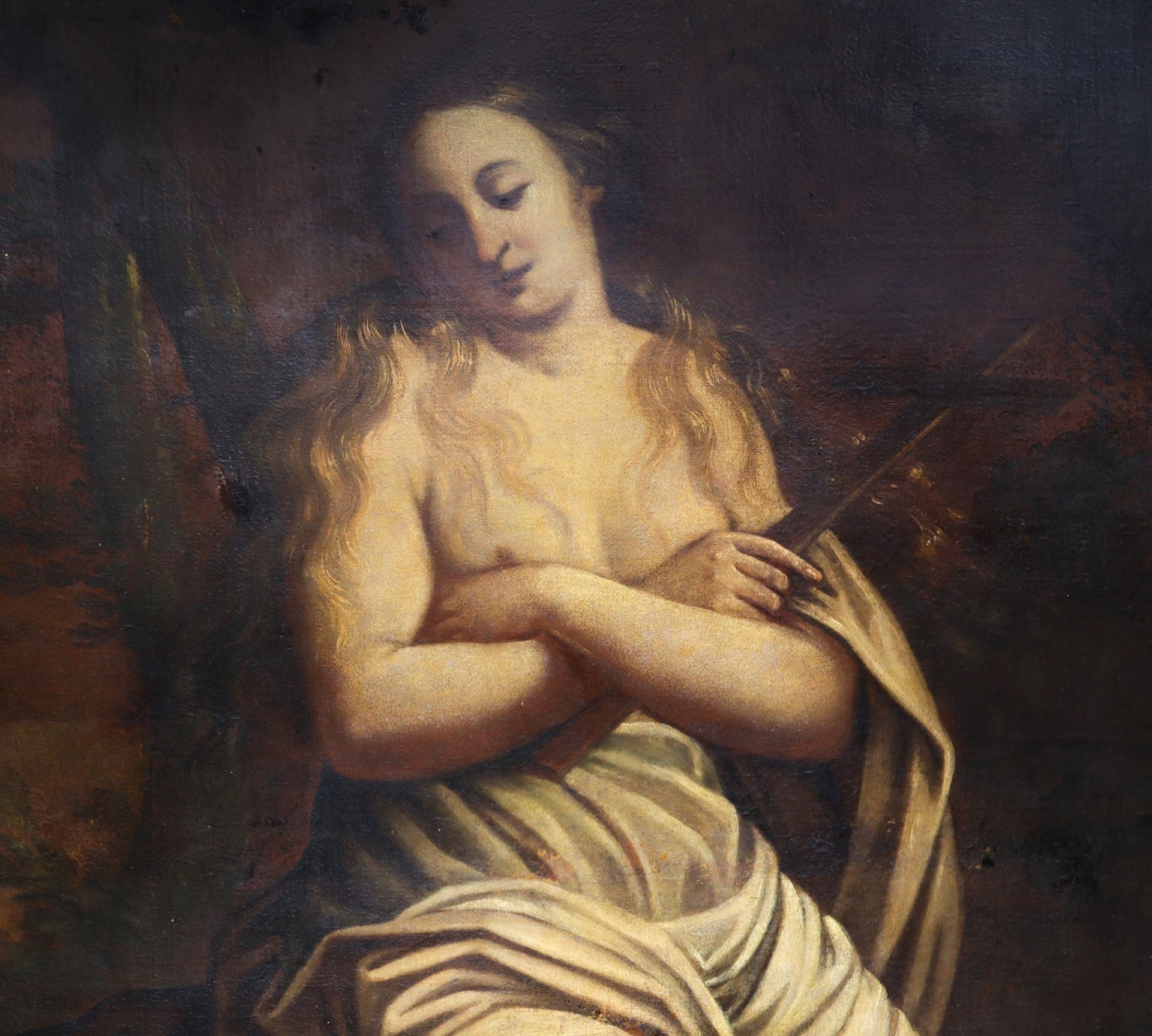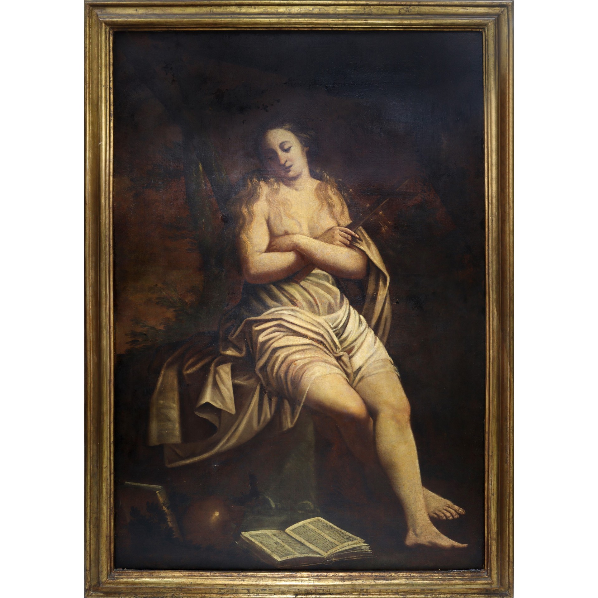 Oronzo Malinconico (Napoli 1661-1709) - Maddalena penitente, 17° secolo cm 180x121, in cornice cm 195x145 Olio su tela Perizia del Professore Claudio Strinati: «Il dipinto deriva da un noto prototipo dell’ambiente guercinesco molto imitato per tutto il Seicento e oltre nelle varie scuole d’ Italia. Qui la figura è intera e l’opera è arricchita da una pregevole Natura Morta ai piedi della Santa. Il quadro è condotto con un disegno assai corretto e appare ben lumeggiato alla moda “tenebrista” che dall’ambiente veneto si irraggia