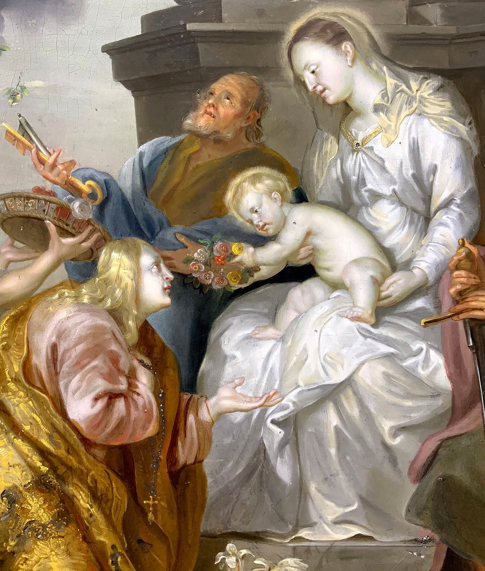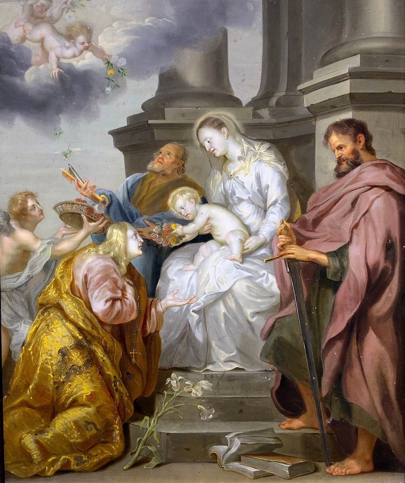 Santa Rosalia con Madonna, Gesù bambino e Santi Pietro e Paolo a finere, 17° secolo cm 43 x cm 35 olio su tavola di rovere Pittore fiammingo del XVII Secolo. Riferimento alla pala da Antoon van Dyck presente al Kunsthistorisches Museum (Vienna)