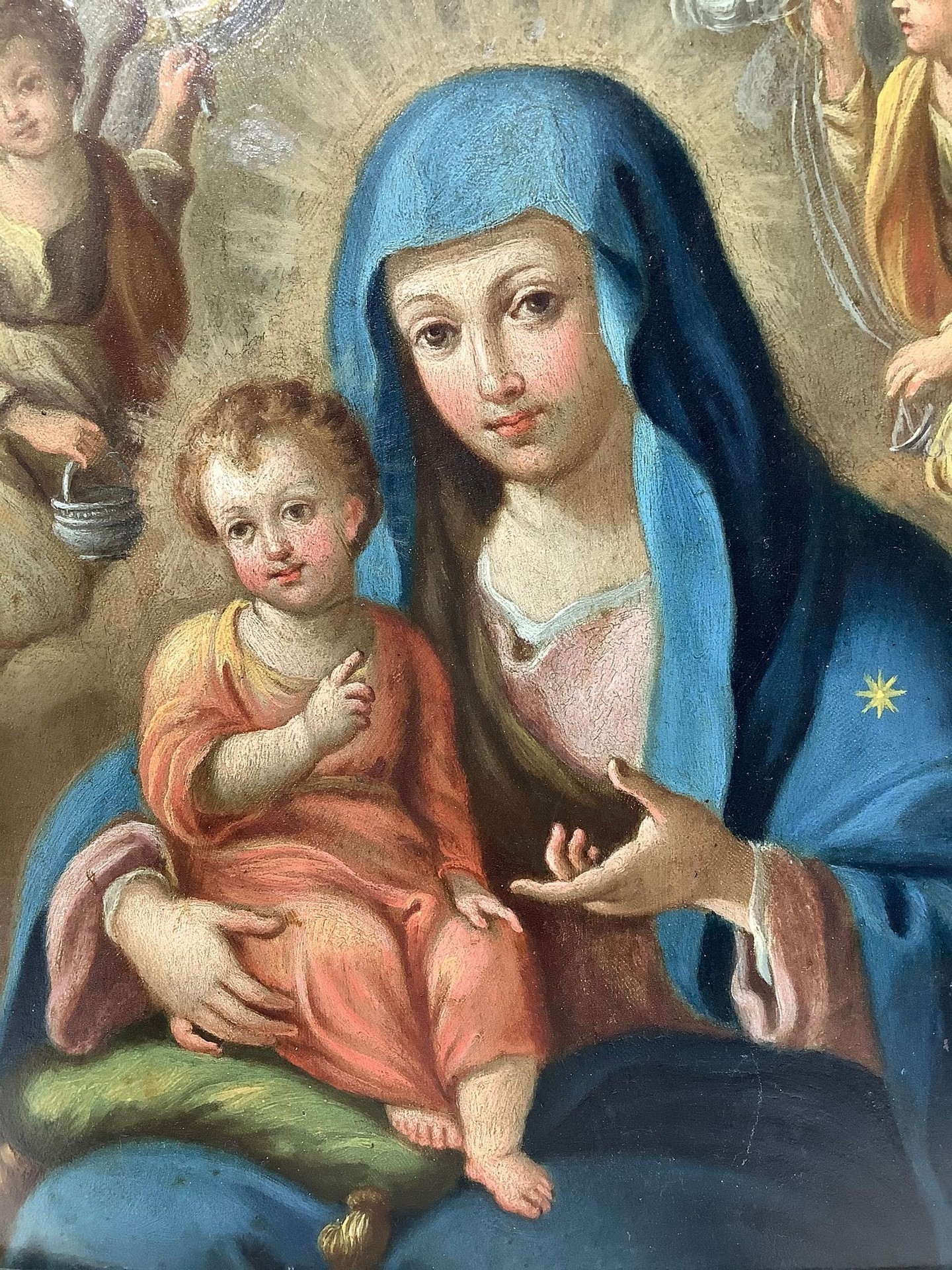 Madonna della mano santa, fine 18° secolo H cm 29x19 - In cornice H cm 37x28. Olio su rame