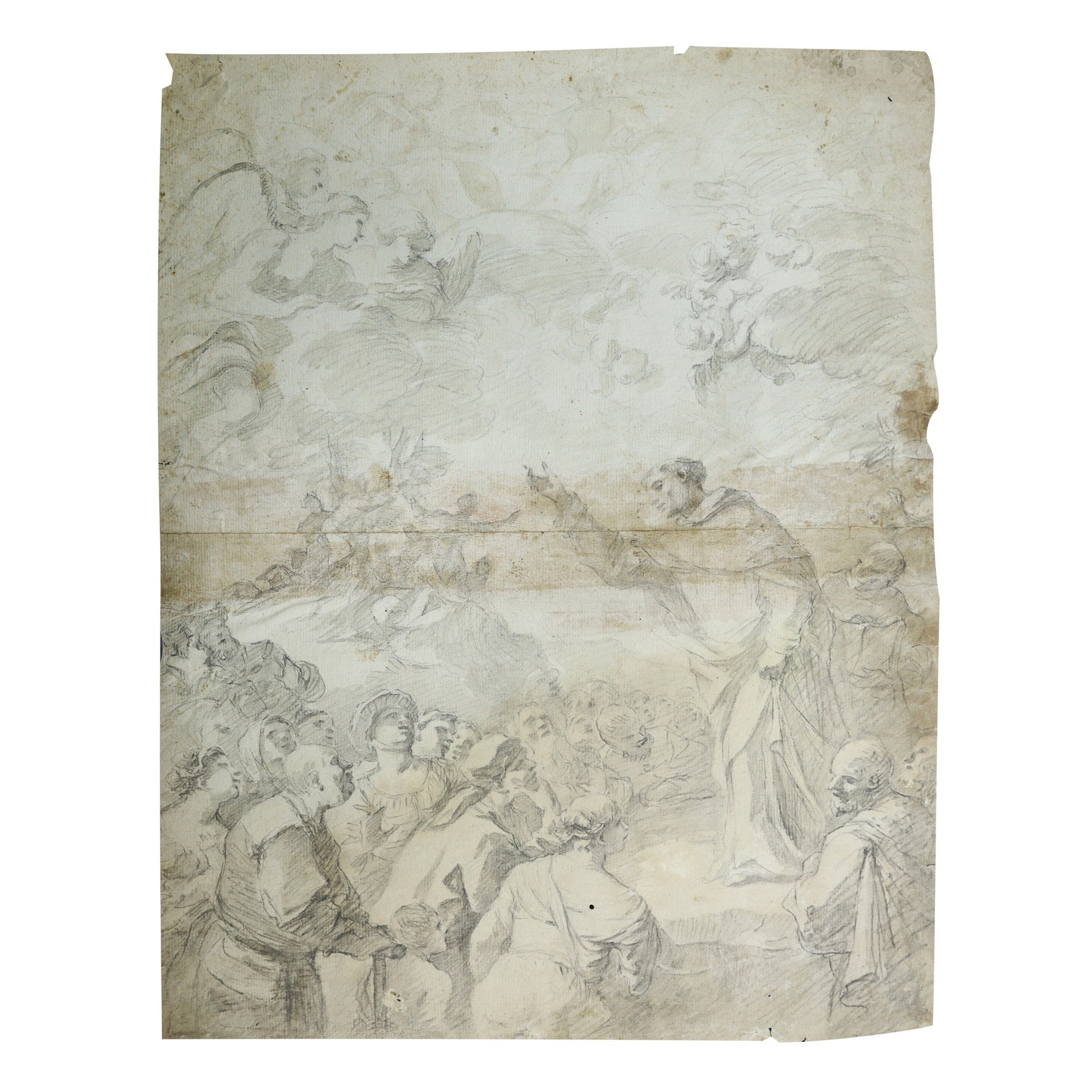 Luca Giordano (Napoli 1634-Napoli 1705) - San Domenico predica alle turbe H mm 540x430 Disegno Perizia del Professore Claudio Strinati: «Si tratta di un magnifico disegno autografo del grande pittore napoletano, studio preparatorio per una paletta d’ altare probabilmente eseguita dal Giordano nell’ambito dei vasti lavori per la chiesa di san Domenico Maggiore a Napoli. Quasi tutte le opere (che furono numerose tra tele e affreschi) eseguite dal sommo Maestro per l’immenso tempio domenicano partenopeo sono rimaste in loco, ma alcune sono scomparse o per meglio dire non si trovano più nei siti di appartenenza.