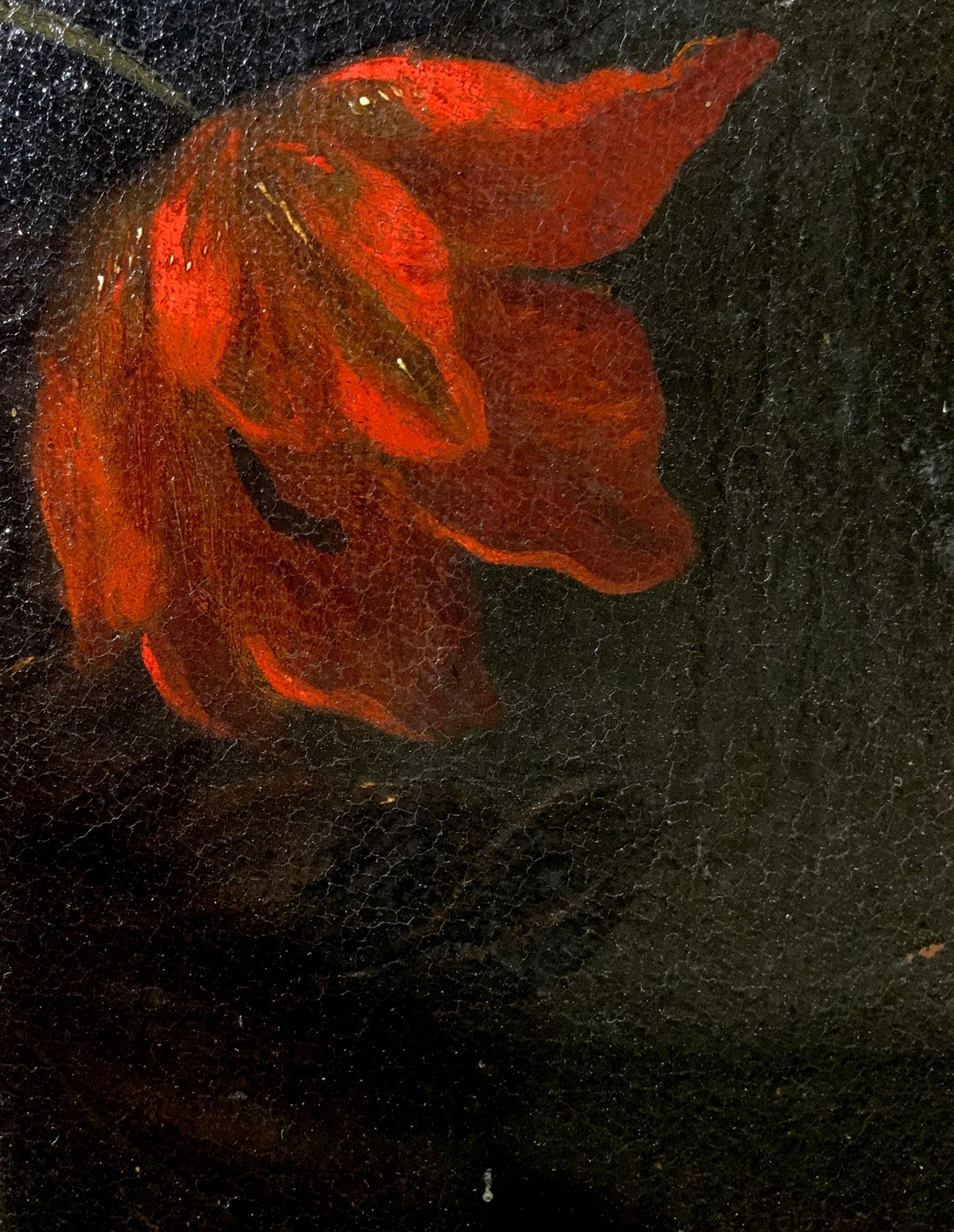Mario Nuzzi Mario de' Fiori (attribuito_a) (Roma 1603-Roma 1673) - Trionfo di fiori in vaso di bronzo su piano di pietra, 17° secolo cm 100 x cm 75 Dipinto a olio su tela Le opere singole del pittore realizzate per le committenze più importanti sperimentano un nuovo stile elegantissimo e ricco, teso a svincolarsi da un repertorio strettamente botanico e didattico. In quest'opera il pittore rafforza la propria inventiva raggiungendo il più alto livello qualitativo con raffinate composizioni floreali in vaso singolo. Il nucleo centrale: delfinium, tulipani, garofani, rose ecc emanano una luce centrale che li rende vivi e leggeri come piume a cui fa riscontro la sensibilità e l'estetica caravaggesca del pittore mettendo in ombra chiaroscurale i fiori retrostanti. In tal modo risulta impreziosita la felicità cromatica del primo piano. Tipico di Mario dè Fiori: il caravaggismo ereditato dal Salini, l'impronta espositiva , il dettagliato descrittivismo dei fiori permeato da un cromatismo luministico. Inoltre appare evidente il riferimento alla tradizione dei maestri fiammingi e olandesi della fine del '500. Nonostante l'impostazione frontale del dipinto, l'ariosa disposizione dei fiori conferisce una profondità spaziale ed un'ampiezza di respiro alla composizione floreale. Ovale in cornice coeva in legno dorato.