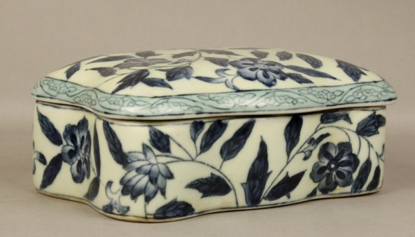 Scatola in porcellana bianca e blu raff. ''SOGGETTI FLOREALI''. Cina. Fine XIX secolo. Mis. Lung. cm. 20 Alt. cm. 9 Prof. cm. 13 ca.