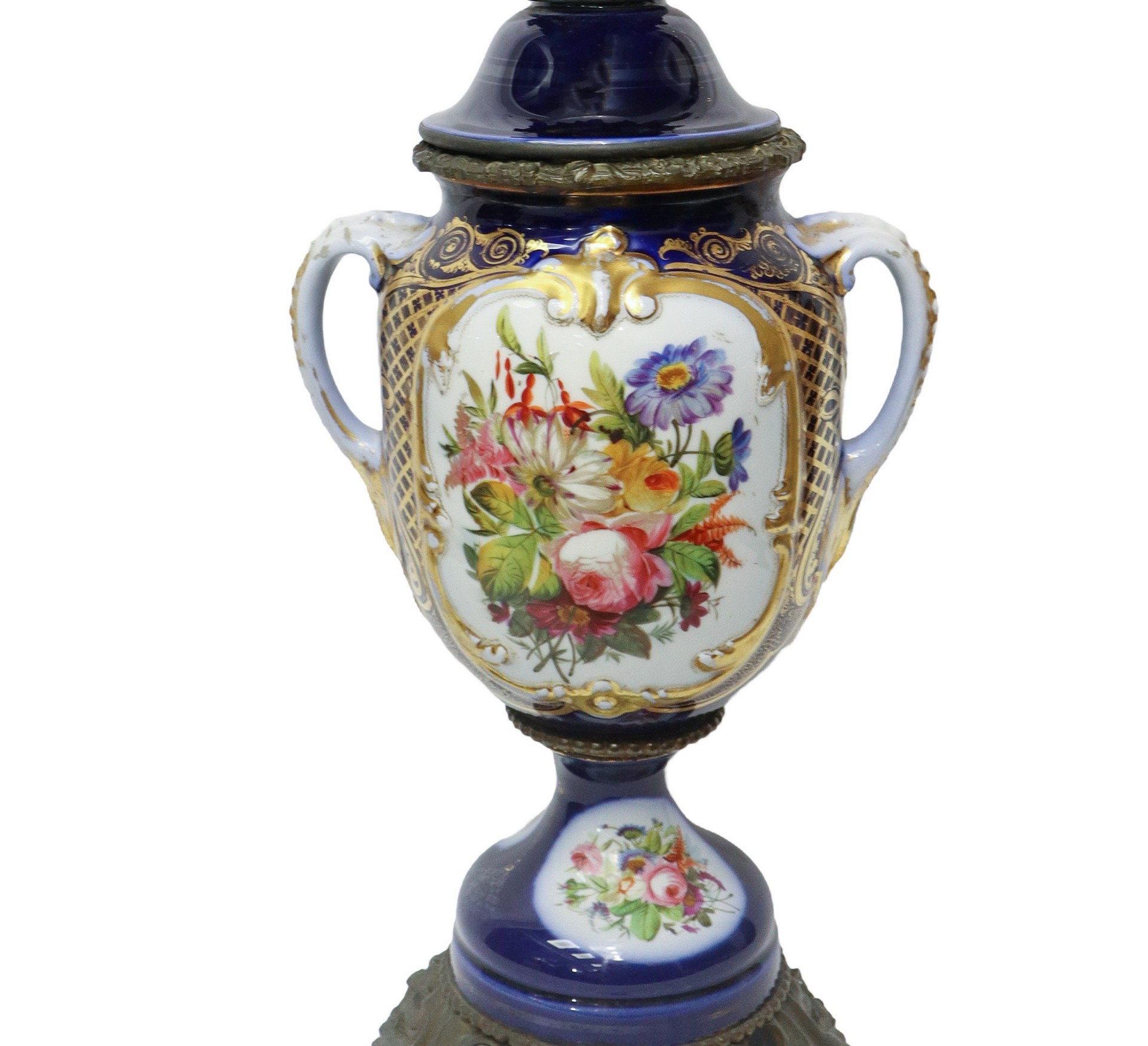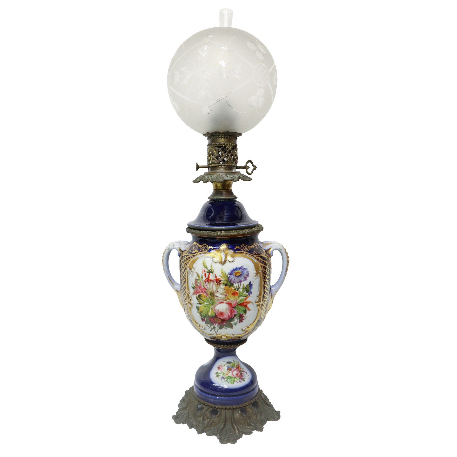 Sevres- Vincennes - Lume a petrolio in porcellana blu con manici, diffusore a palla in vetro dipinto a fiori, Old France, 19° secolo
