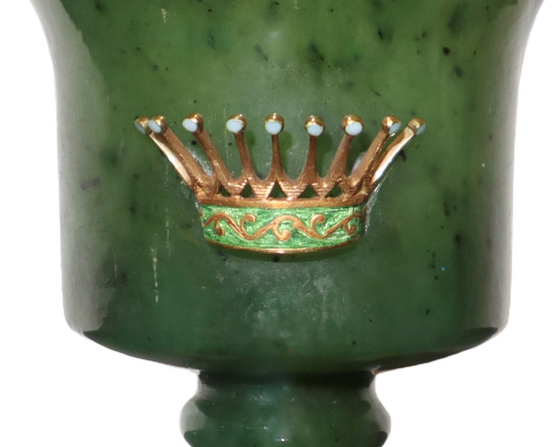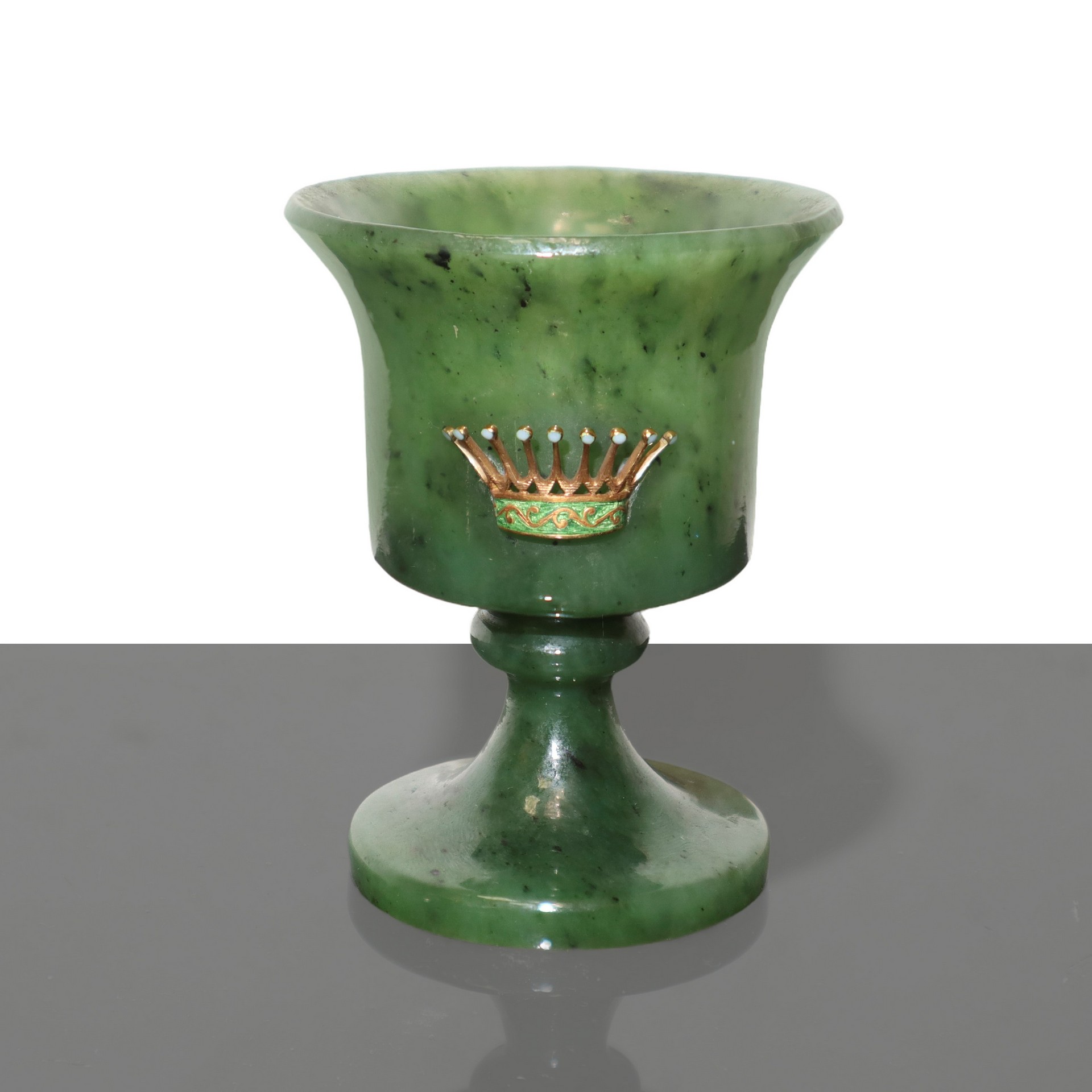 Piccolo cratere in giada verde spinacio con applicazione di corona in oro a forma con brillanti e pietre dure