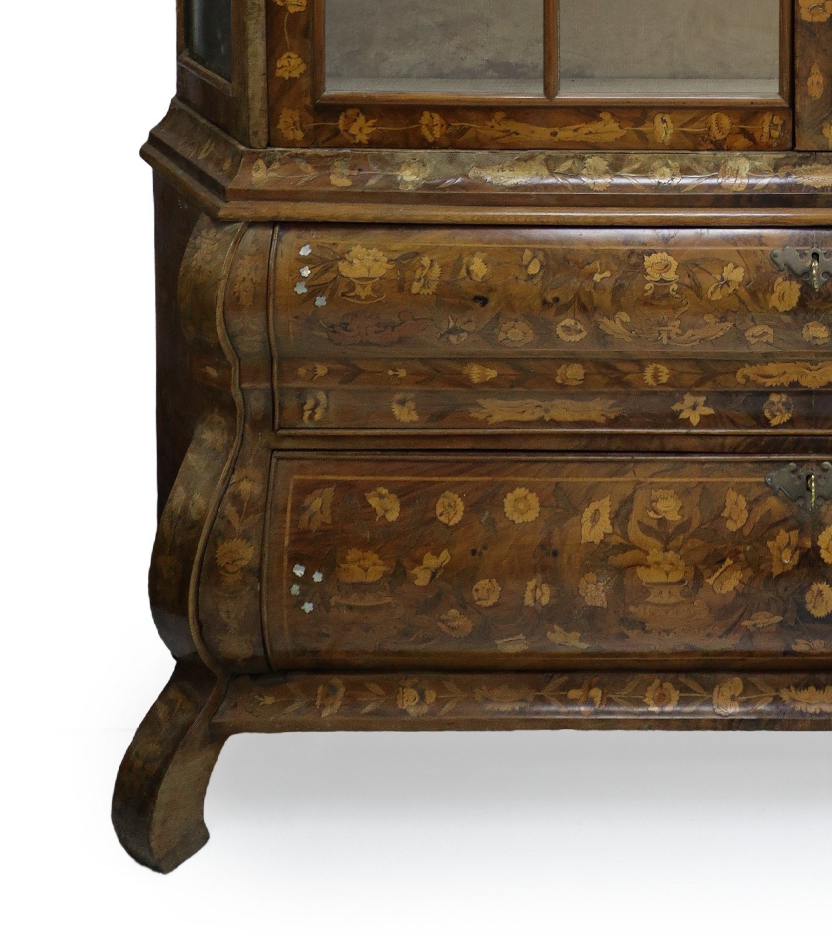 Credenza olandese a due corpi intarsiata a motivi floreali, scantonata ai lati con specchi, al centro due sportelli a vetri, base con due cassetti, fine 18° secolo