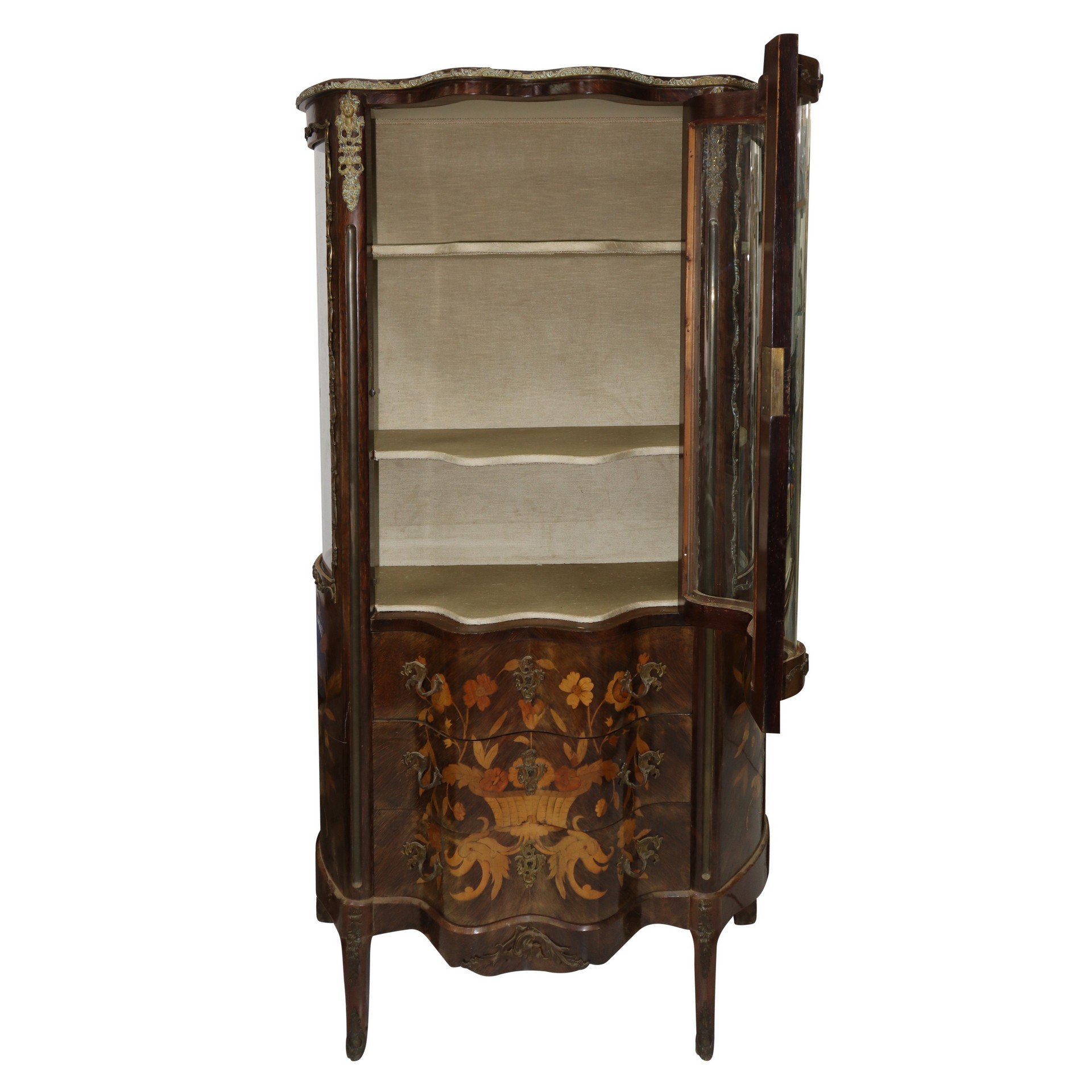 Vetrina in legno di palissandro con intarsi floreali, nineteen° secolo H cm 171x86x44 Maniglie e bronzi e ottoni applicati. Parte superiore a vetri curvilinei. Alla base tre cassetti. Maniglie e bronzi e ottoni applicati. Parte superiore a vetri curvilinei. Alla base tre cassetti.