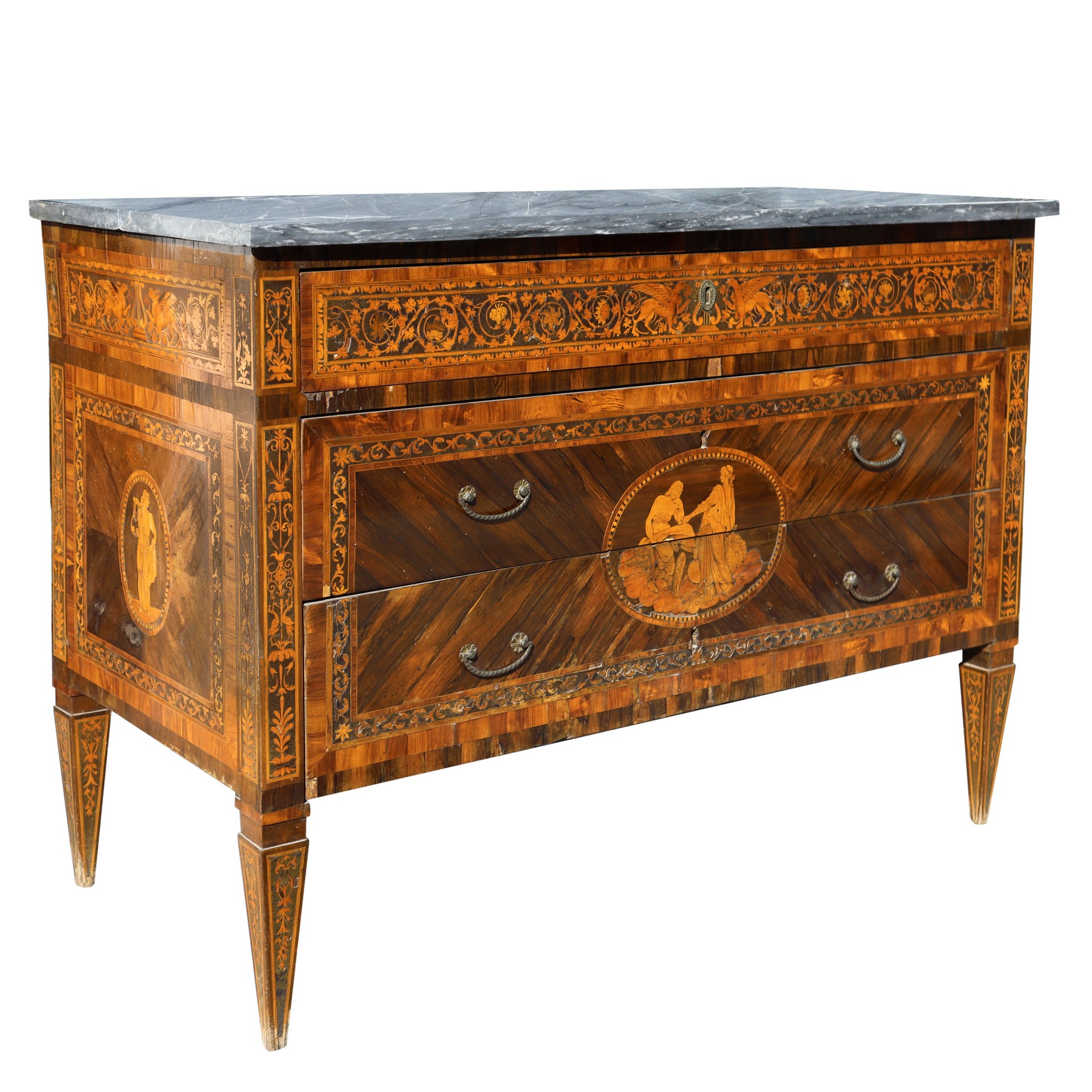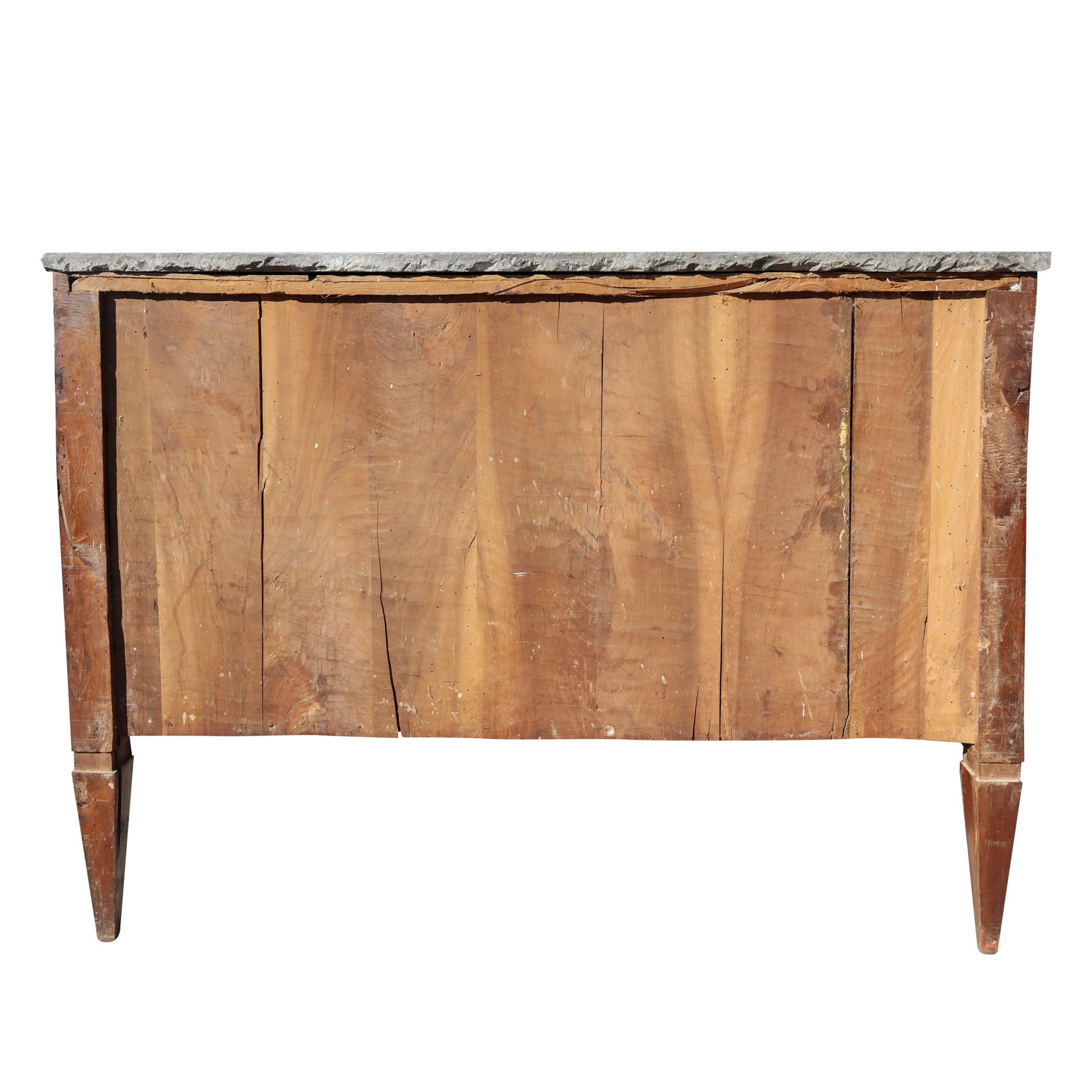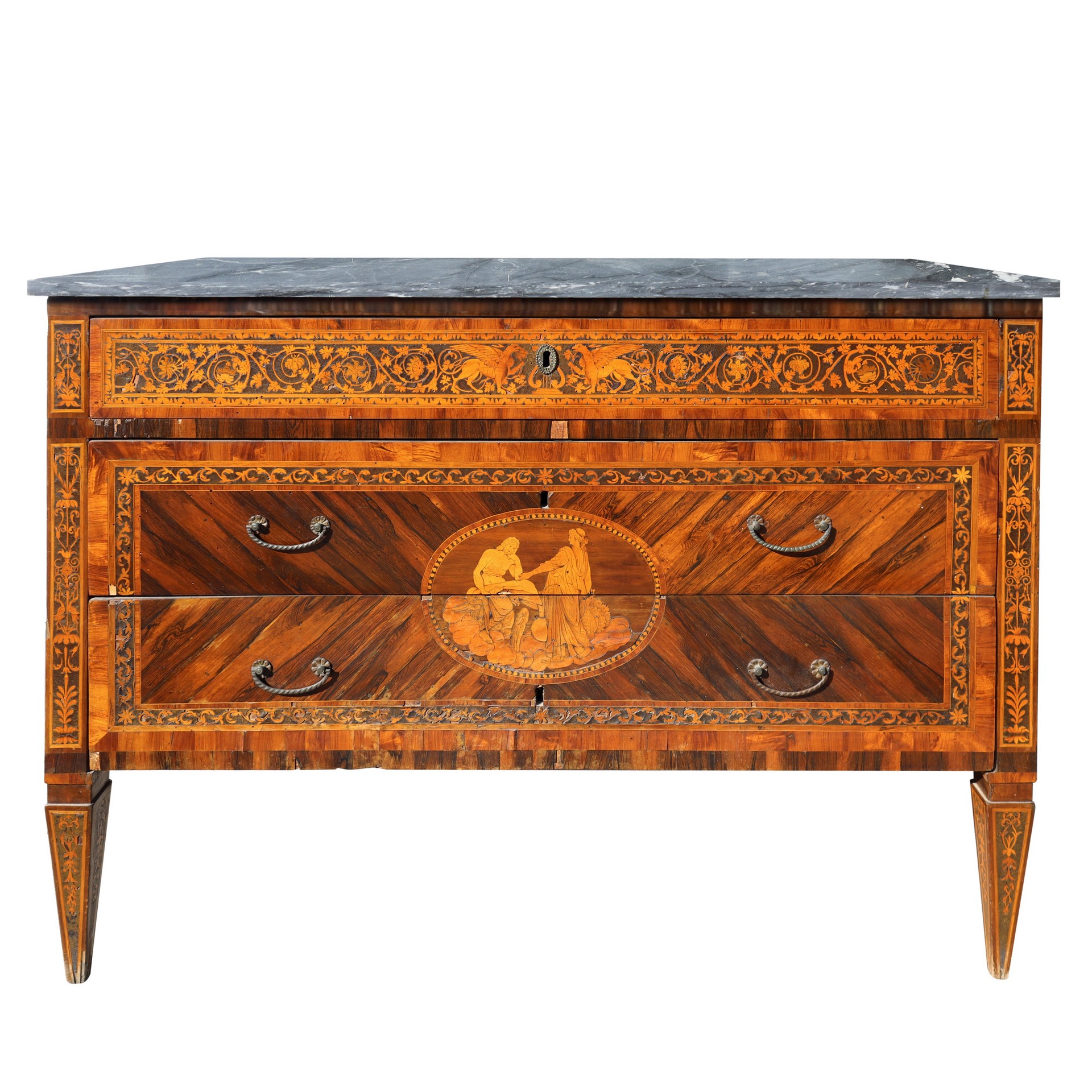 Cassettone in legno di palissandro neoclassico alla Maggiolini , 18th/19° secolo H cm 90x123x61 Con intarsi in legni chiari sul fronte e ai lati, marmo grigio bardiglio al piano. Piedi troncopirametàali.Con intarsi in legni chiari sul fronte e ai lati, marmo grigio bardiglio al piano. Piedi troncopirametàali.