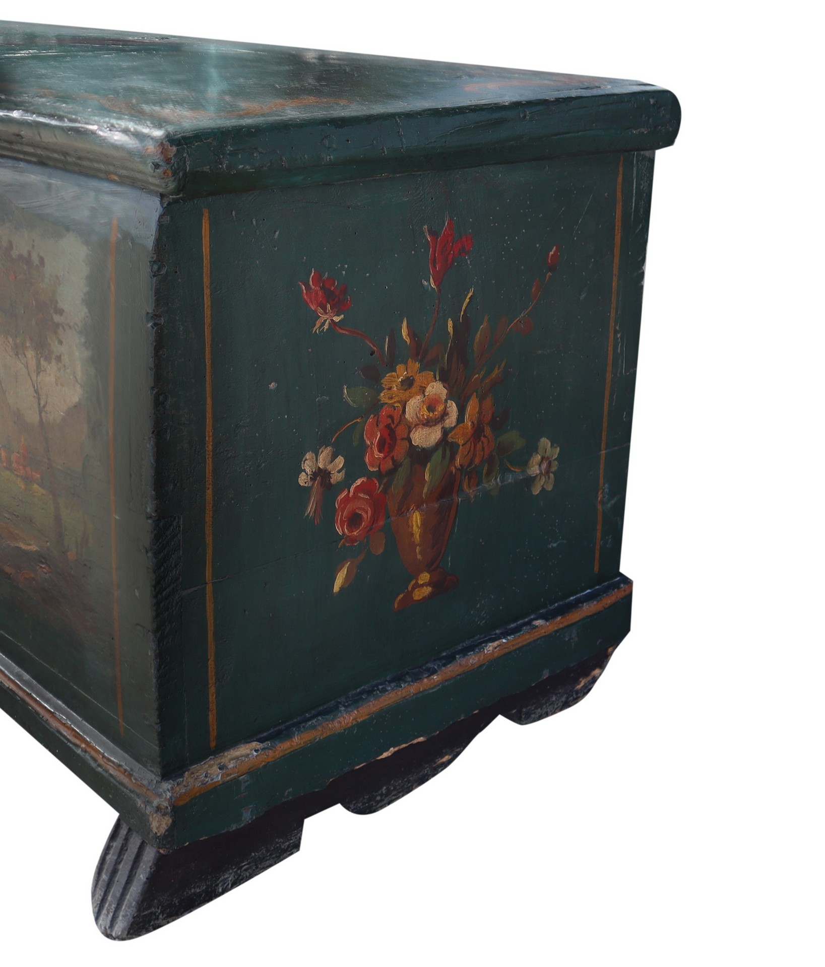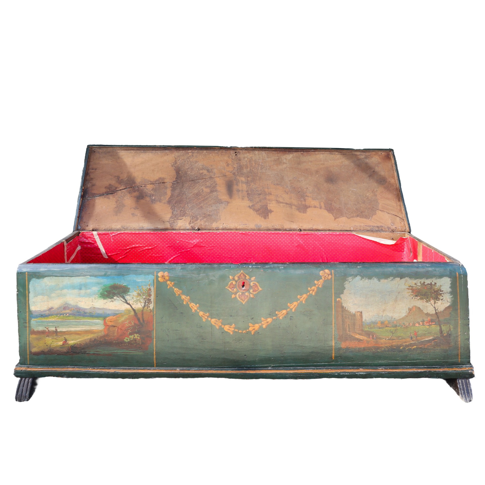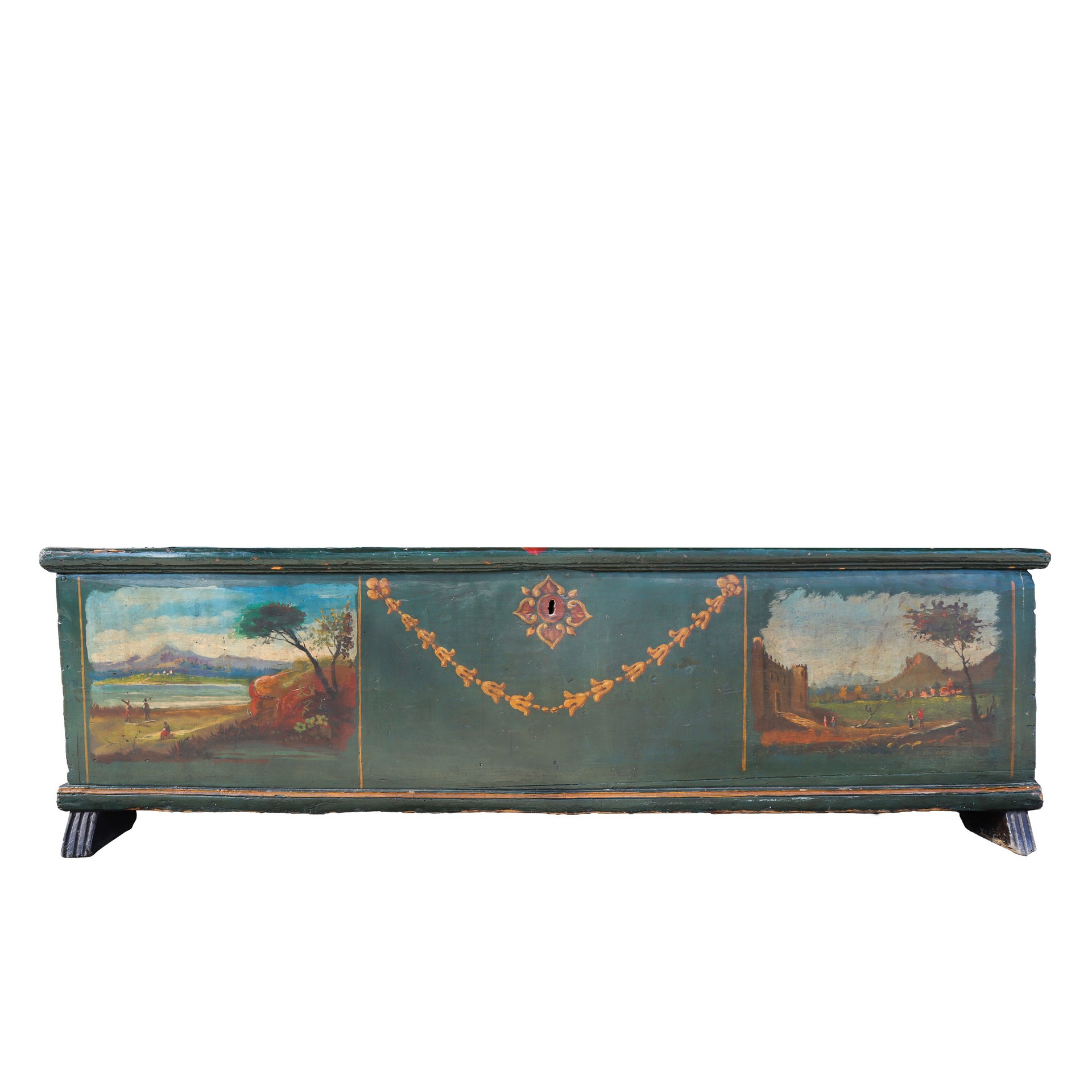 Cassapanca laccata in verde e dipinta, Sicily, 18° secolo H cm 58x187x54 Dipinta con paesaggi e ghirlande sul fronte. Sul piano stemma nobiliare, sui finerali motivi floreali.Dipinta con paesaggi e ghirlande sul fronte. Sul piano stemma nobiliare, sui finerali motivi floreali.