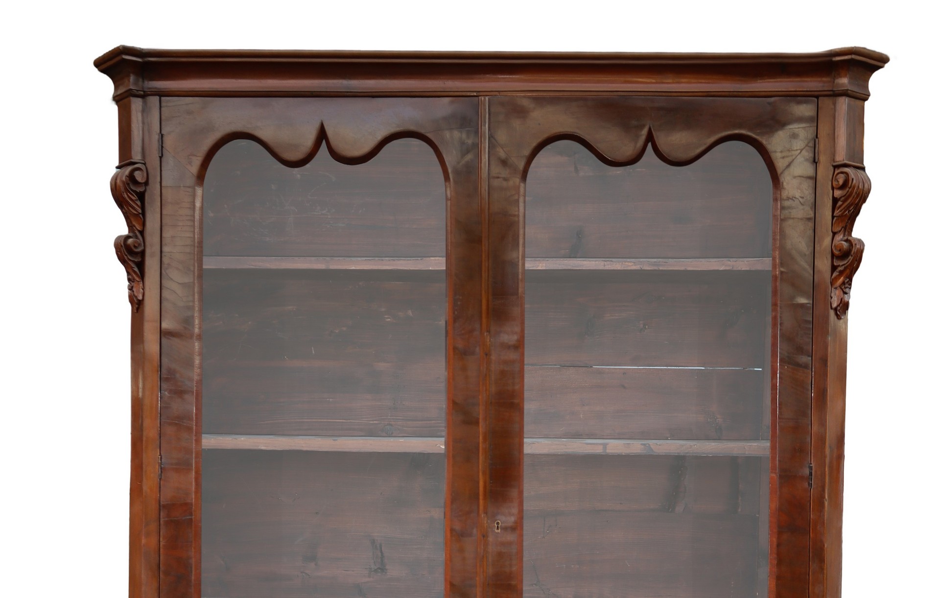 Vetrina credenza in legno di mogano doppio corpo, metà 19° secolo H cm 240x134, max ingombro 146 cm Parte inferiore due sportelli, parte superiore due sportelli a vetri sagomati. Foglie d'acanto intagliate applicate ai latiParte inferiore due sportelli, parte superiore due sportelli a vetri sagomati. Foglie d'acanto intagliate applicate ai lati