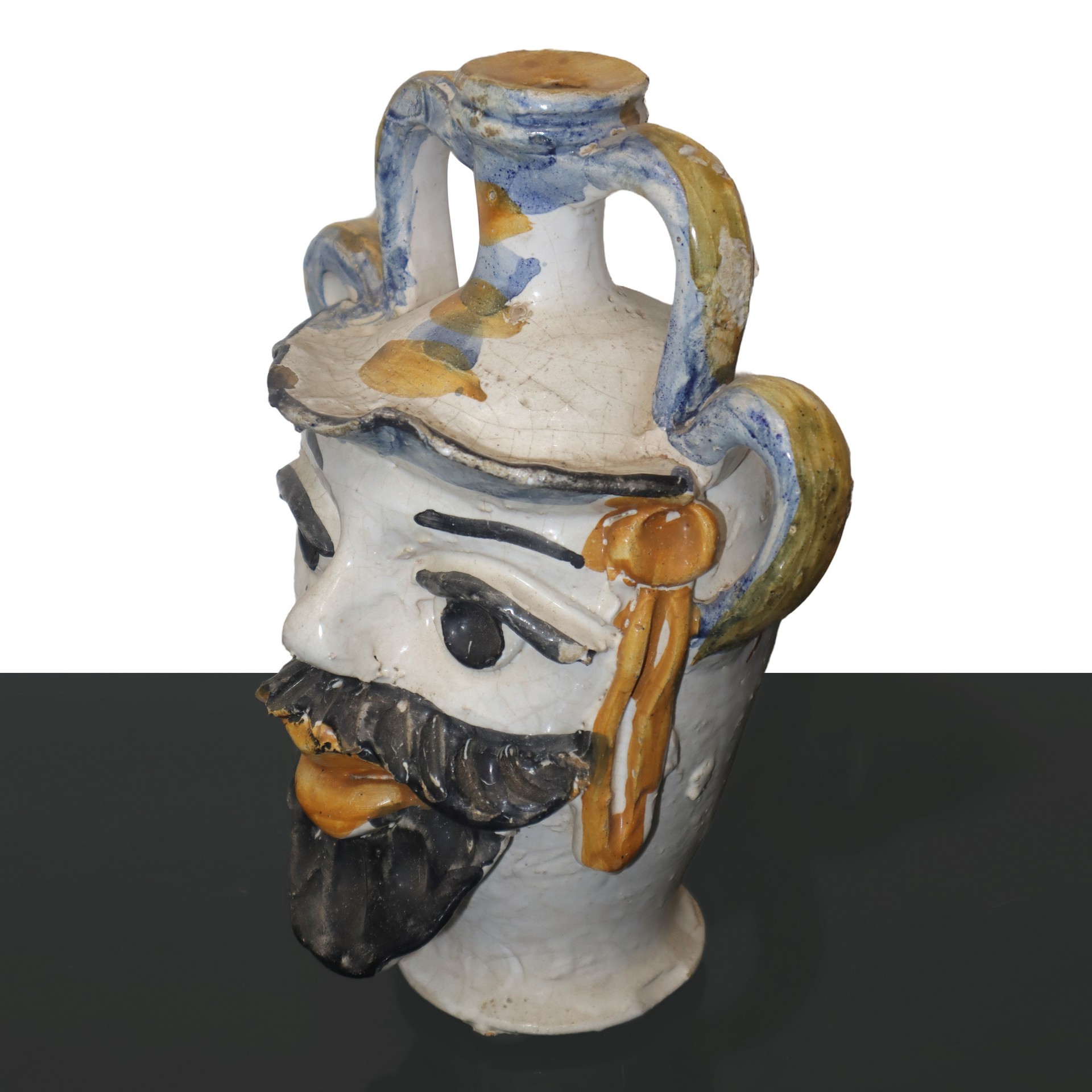 Testa in maiolica policroma di Caltagirone, antropomorfa e con manici., primi 20° secolo