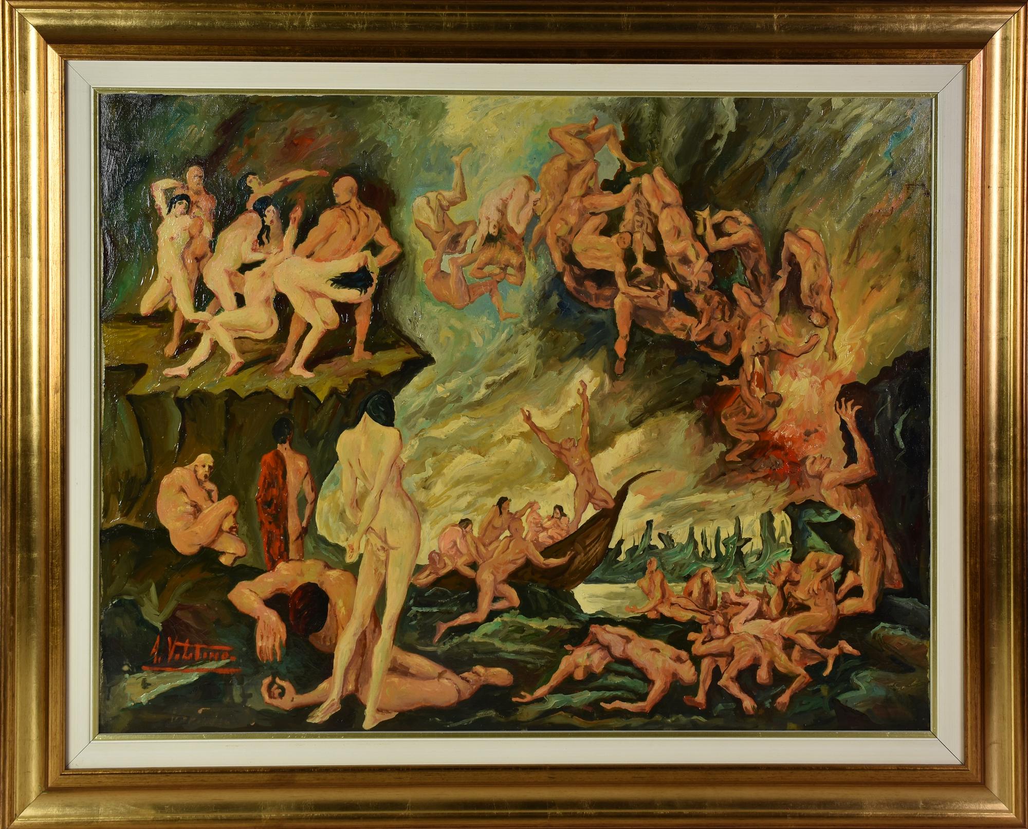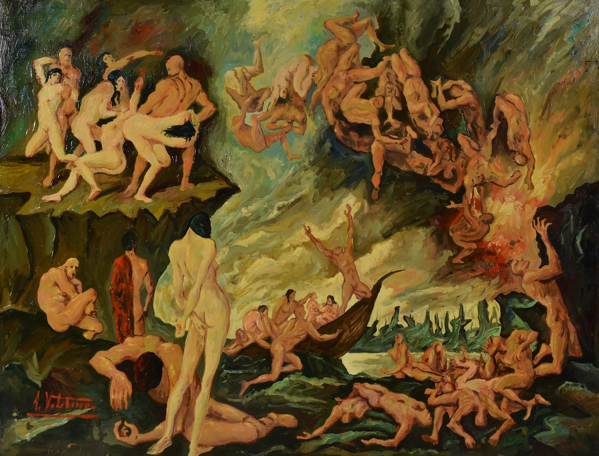 Ignoto ANIME DANNATE AL GUADO DEL COCITO olio su tela, cm 60x80 firma Restauri