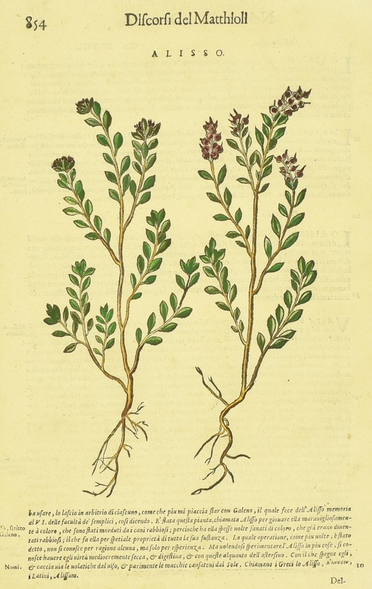 Pietro Andrea Mattioli ALISSO xilografia acquarellata, cm 50x35