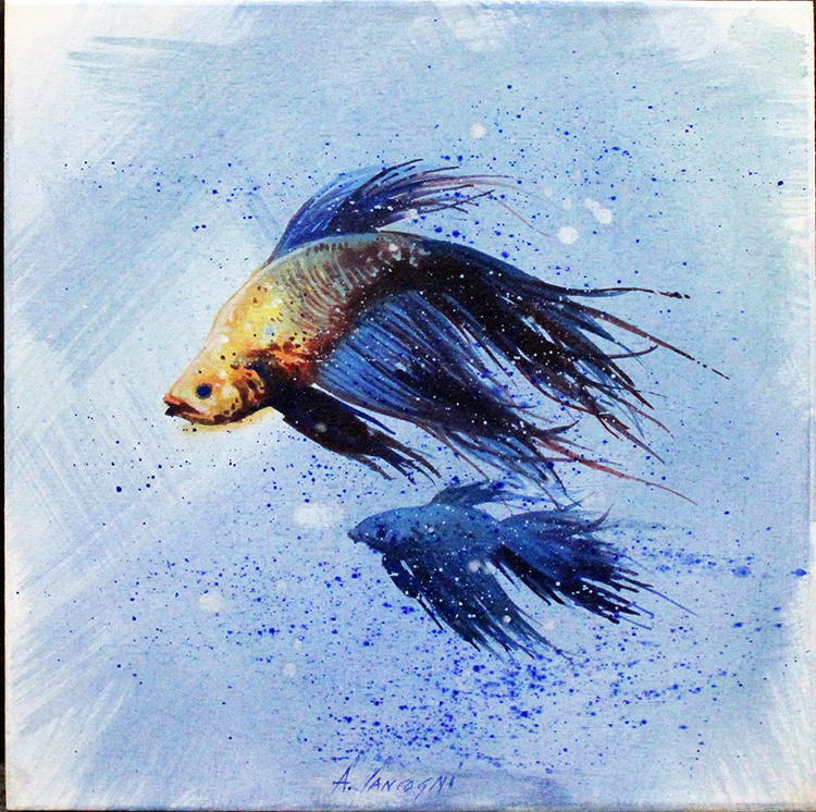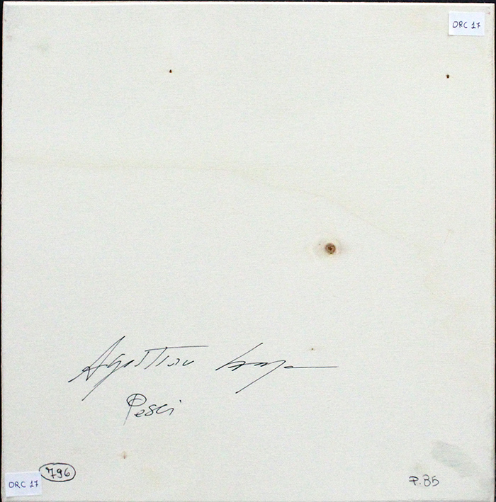 AGOSTINO CANCOGNI, "Pesci", anni 2000, olio su tavola, 30x30. Al fronte: firma in basso al centro, al verso: firma e titolo in basso al centro, autentica su foto dell'artista
