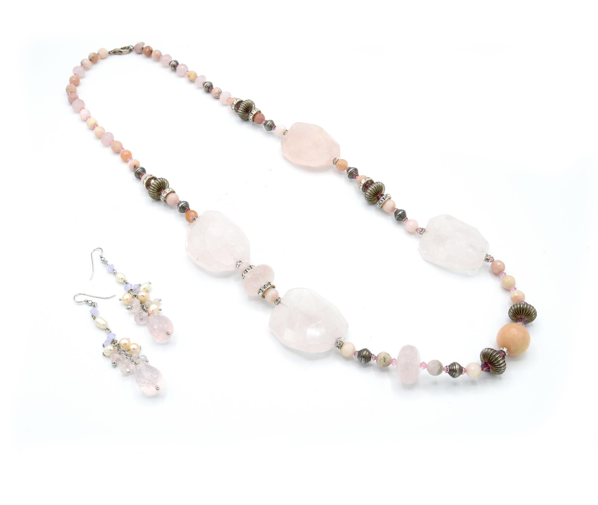 PARURE COMPOSTA DA COLLANA IN PIETRE DURE QUARZI, PERLE DI FIUME E CRISTALLI CON ELEMENTI IN ARGENTO 925 E ORECCHINI