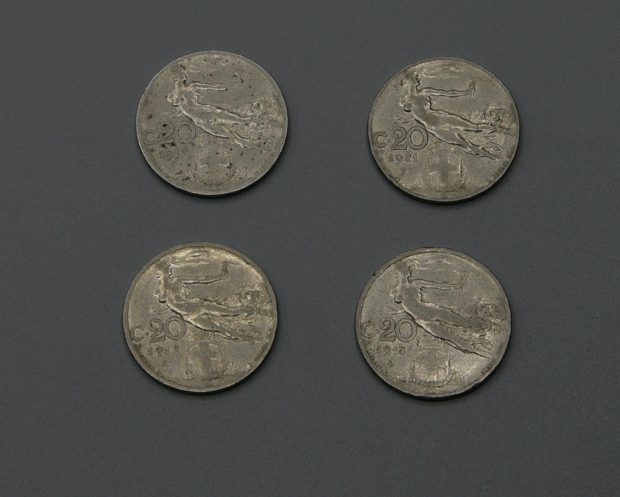 Lot 4 | 4 MONETE DA 20 CENTESIMI, ITALIA, NICHEL, 1910, 1912, 1913, 1921 Materiale:...