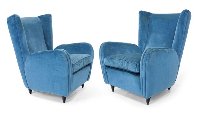 BUFFA PAOLO Coppia di poltrone con struttura in legno e imbottitura rivestita...