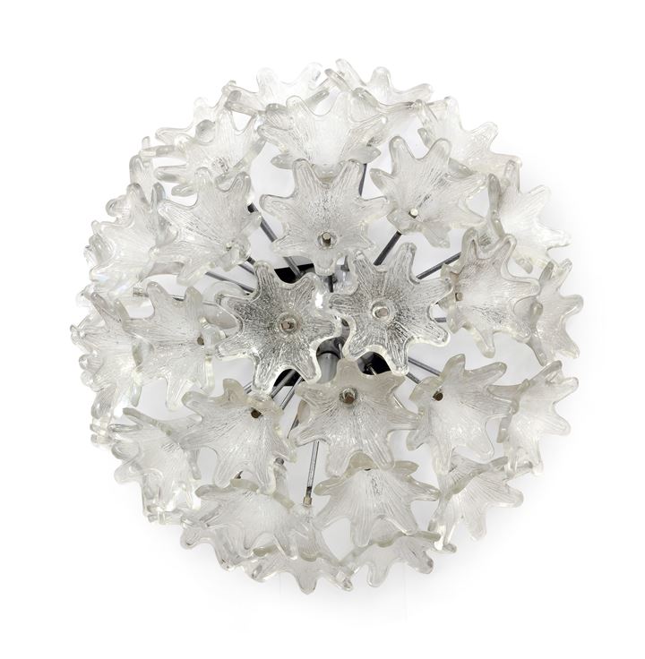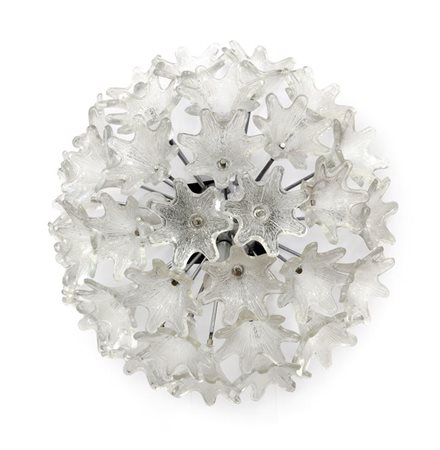 Lampada da parete con struttura in acciaio cromato e campanelle in vetro stampato.