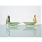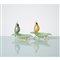 Coppia di ciotole in vetro color agata e oro a foglia con pappagalli in vetro uno verde blu e oro e uno oro, finiture in nero, piedini in vetro trasparente e oro.