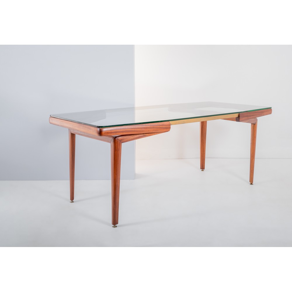 Tavolo da pranzo con struttura in legno di mogano e ottone, importante piano in cristallo di grosso spessore verde Nilo, piede con alte piegature strutturali che conferiscono un movimento aereo ai quattro angoli. Tavolo restaurato.
