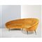 Divano modello “Boomerang” a quattro posti, struttura in legno con imbottitura, rivestimento in tessuto originale di velluto ocra, piedi in metallo verniciato nero ed ottone. Lievi ossidazioni e segni d'uso.