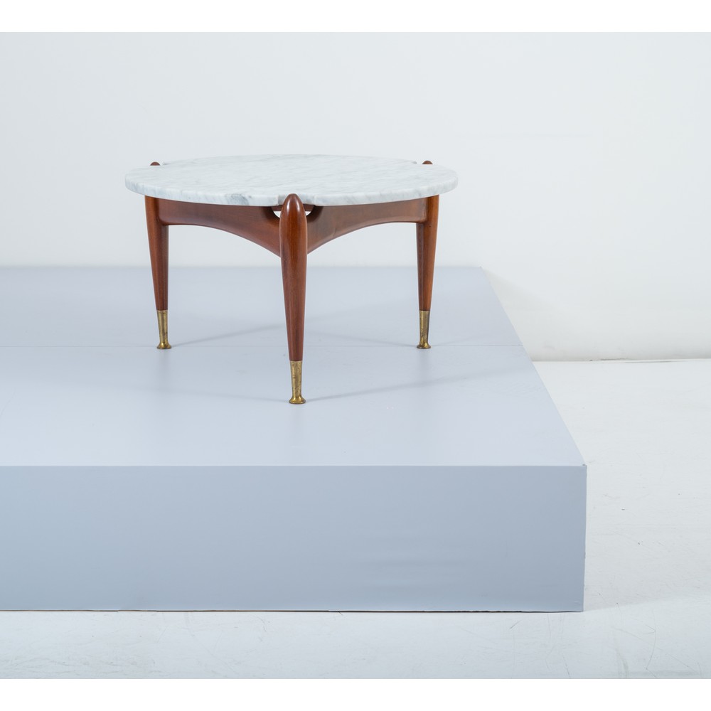 Tavolo da salotto con struttura in legno, gambe a goccia, piano circolare in marmo bianco di carrara, scarpette in ottone.