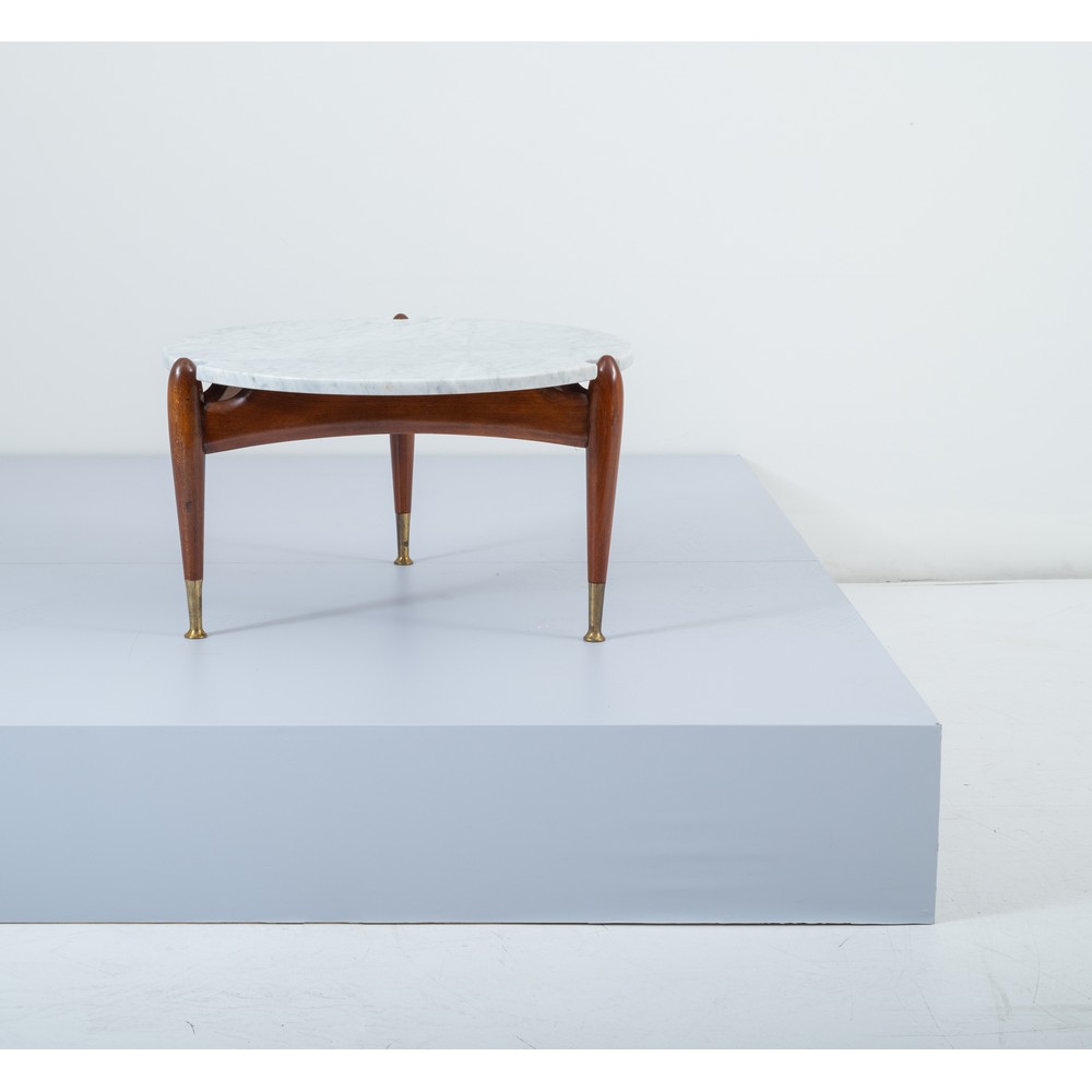 Tavolo da salotto con struttura in legno, gambe a goccia, piano circolare in marmo bianco di carrara, scarpette in ottone.