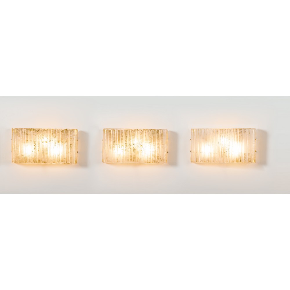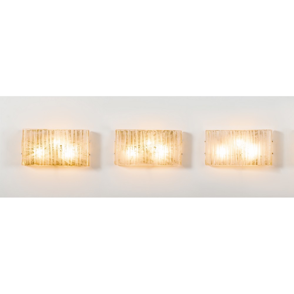 Sei grandi lampade da parete con struttura in metallo verniciato, diffusori in vetro trasparente con inclusioni oro, corpo rettangolare con decori diagonali sulla superficie.