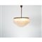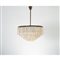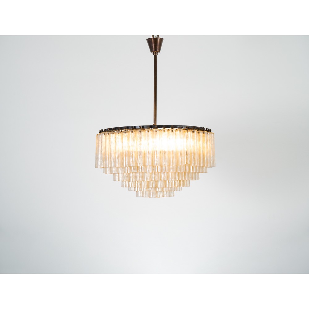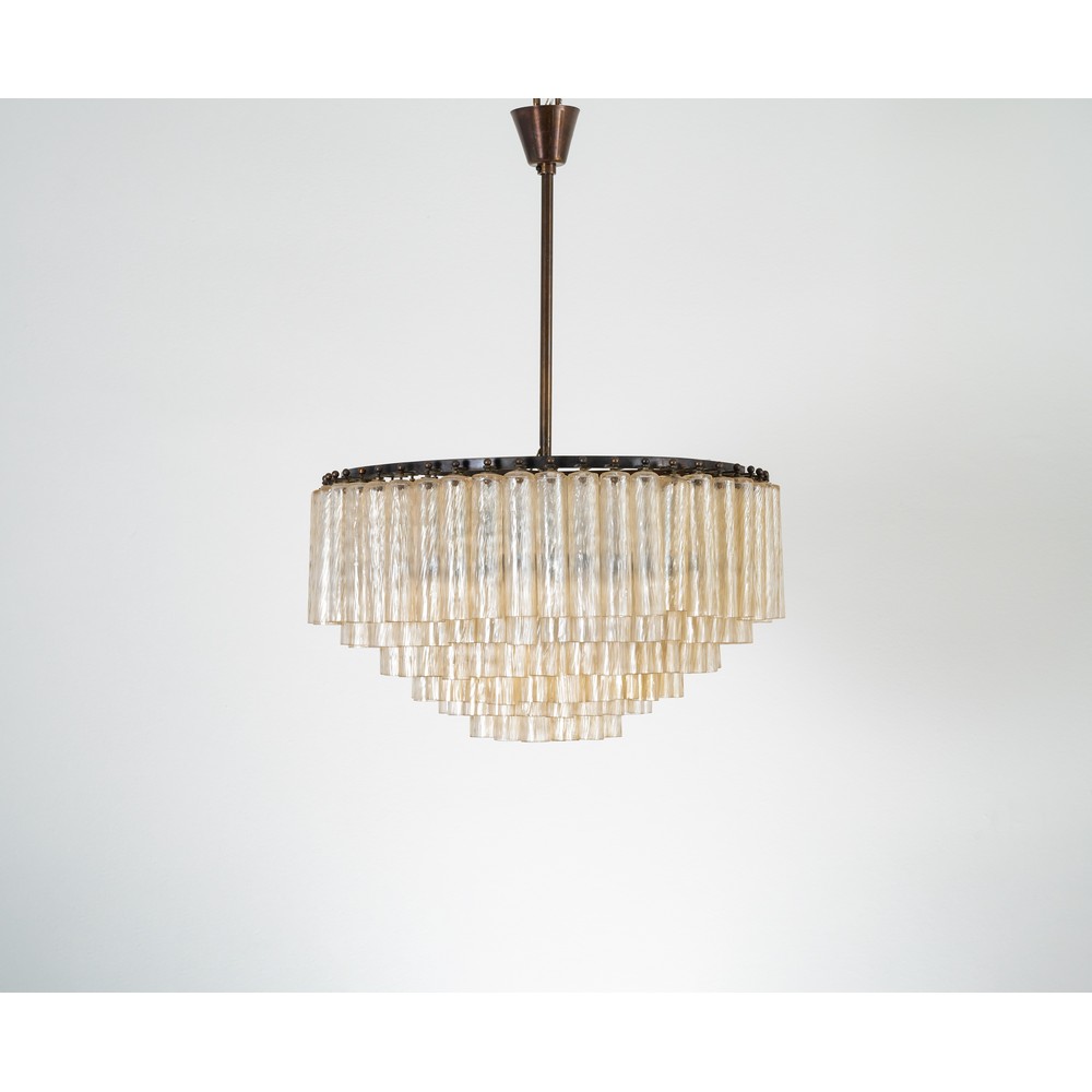 Lampada a sospensione a sei luci con struttura in ottone, diffusore composto da elementi a sei ordini di altezza cilindrici a calza in vetro trasparente lavorato a corteccia e impernati singolarmente.