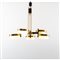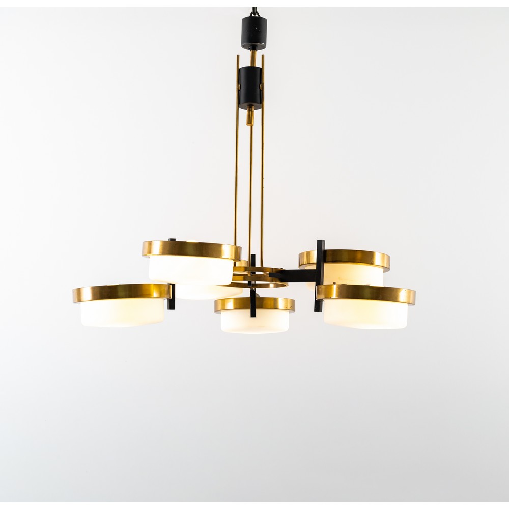 Lampada a sospensione a sei luci con struttura in ottone e ottone verniciato nero, diffusori circolari a piatto in vetro opalino.