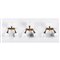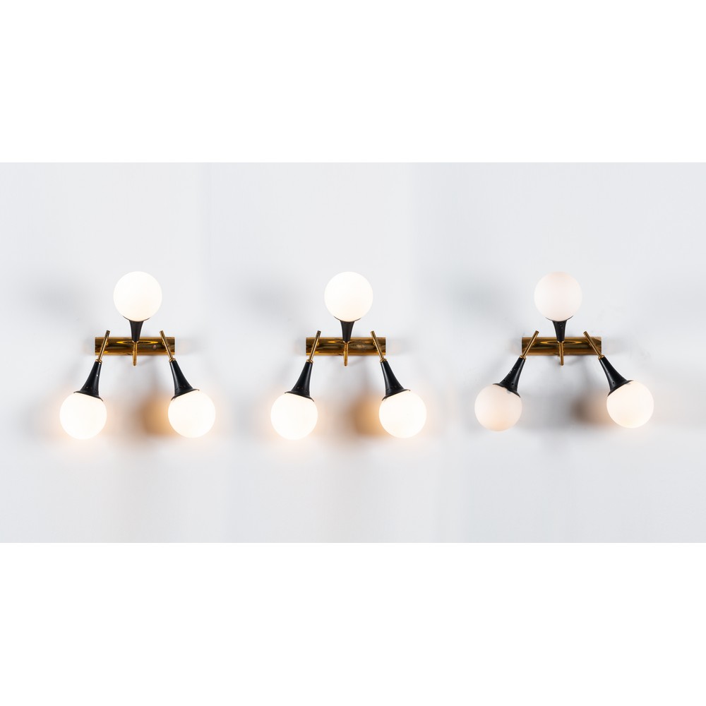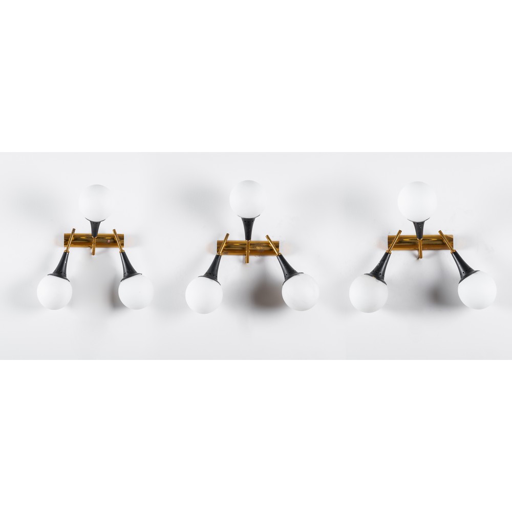 Tre Lampade da parete a tre luci con struttura in ottone e ottone verniciato nero, diffusori sferici in vetro opalino. Lievi graffi e ossidazioni.