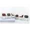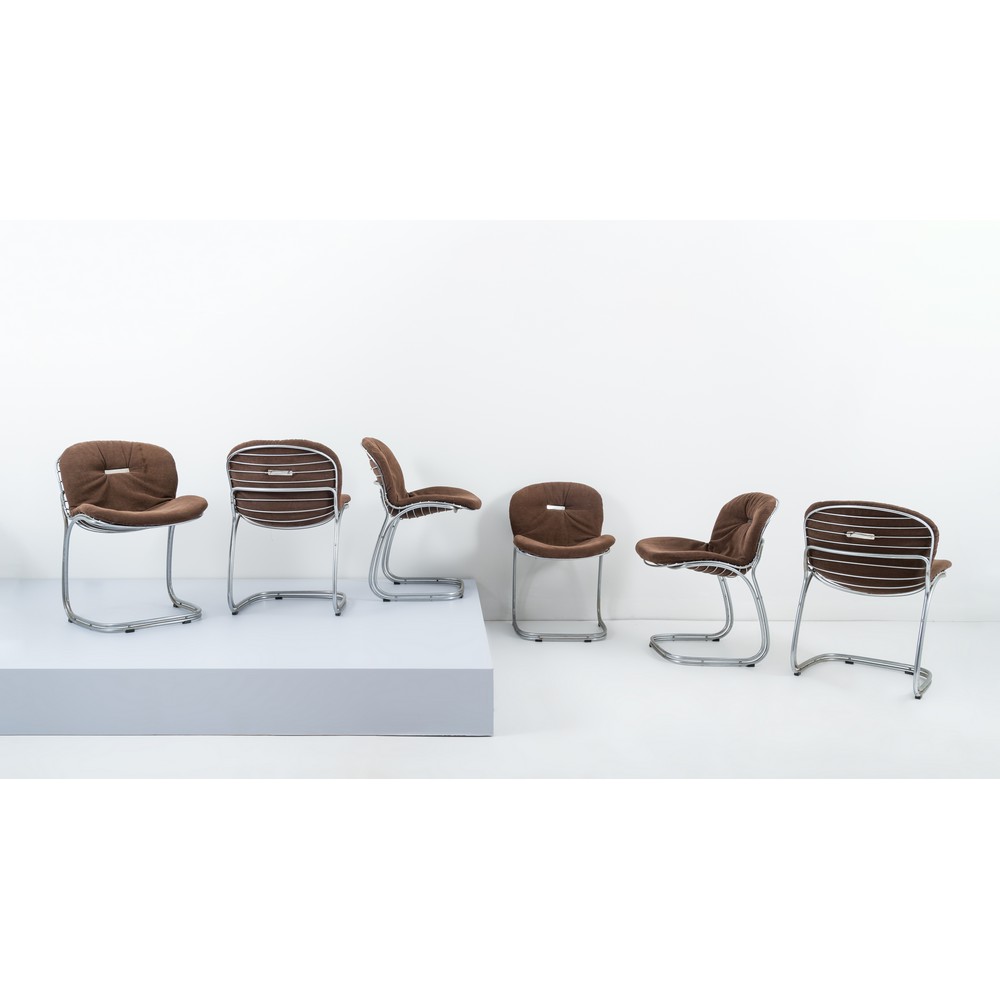 Sei sedie modello “Sabrina” con struttura in metallo cromato curvato, seduta e spalliera con imbottitura e rivestimento in tessuto marrone.