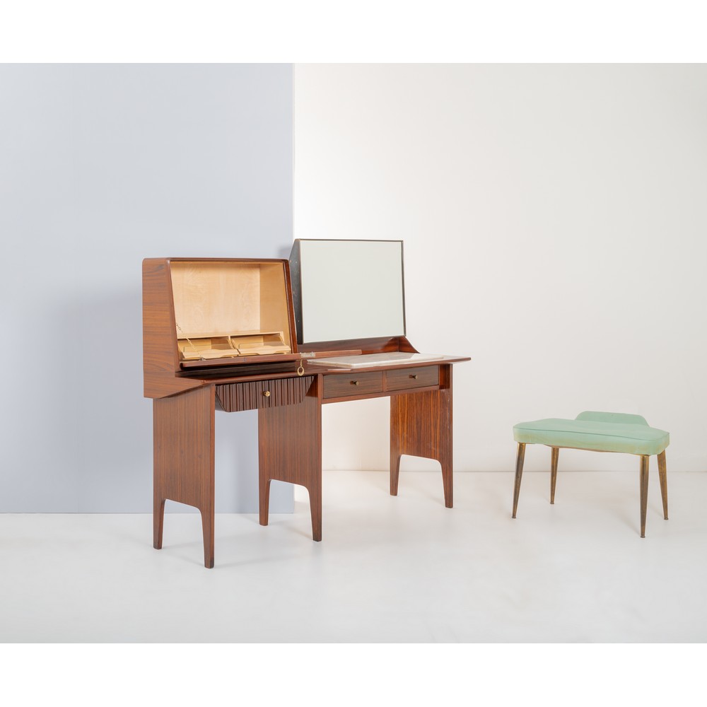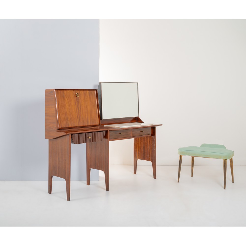 Toeletta in legno esotico, composta da due parti, una parte con specchio incassato in cornice di ottone, piano in marmo e due cassetti sottostanti; l’altra con vano superiore a ribalta e due cassetti interni, un cassetto sottostante, interno degli arredi in acero. Una panchetta con piedi in ottone e seduta imbottita e rivestita con tessuto verde.