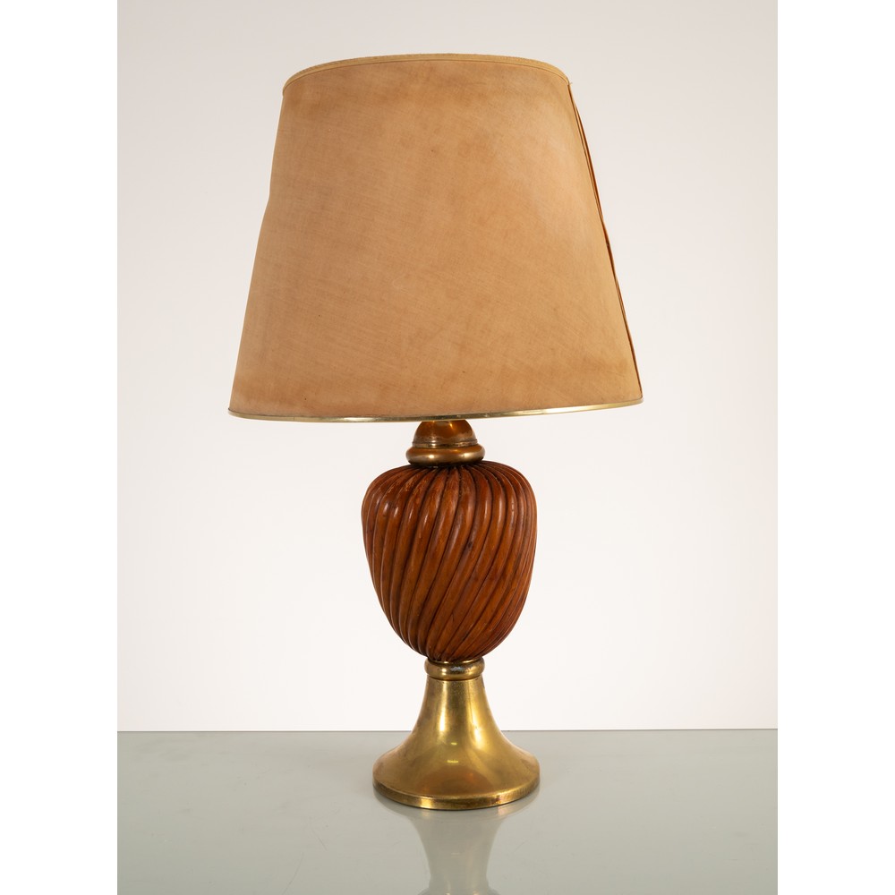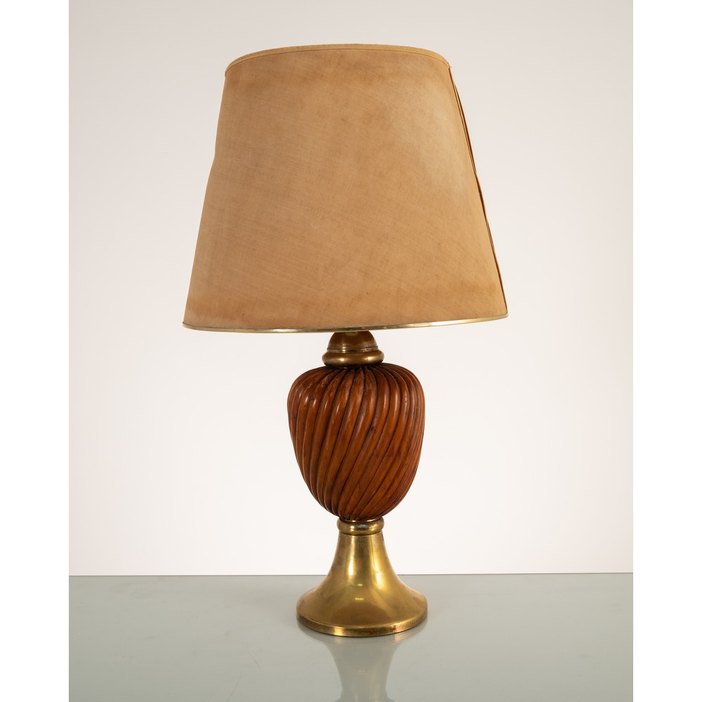 Lampada da tavolo a due luci, base e attacco superiore in ottone, corpo a vaso in legno decorato con costolature a torchon, diffusore originale in ottone e tessuto chiaro.