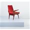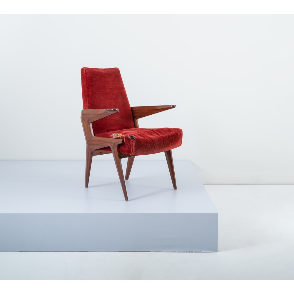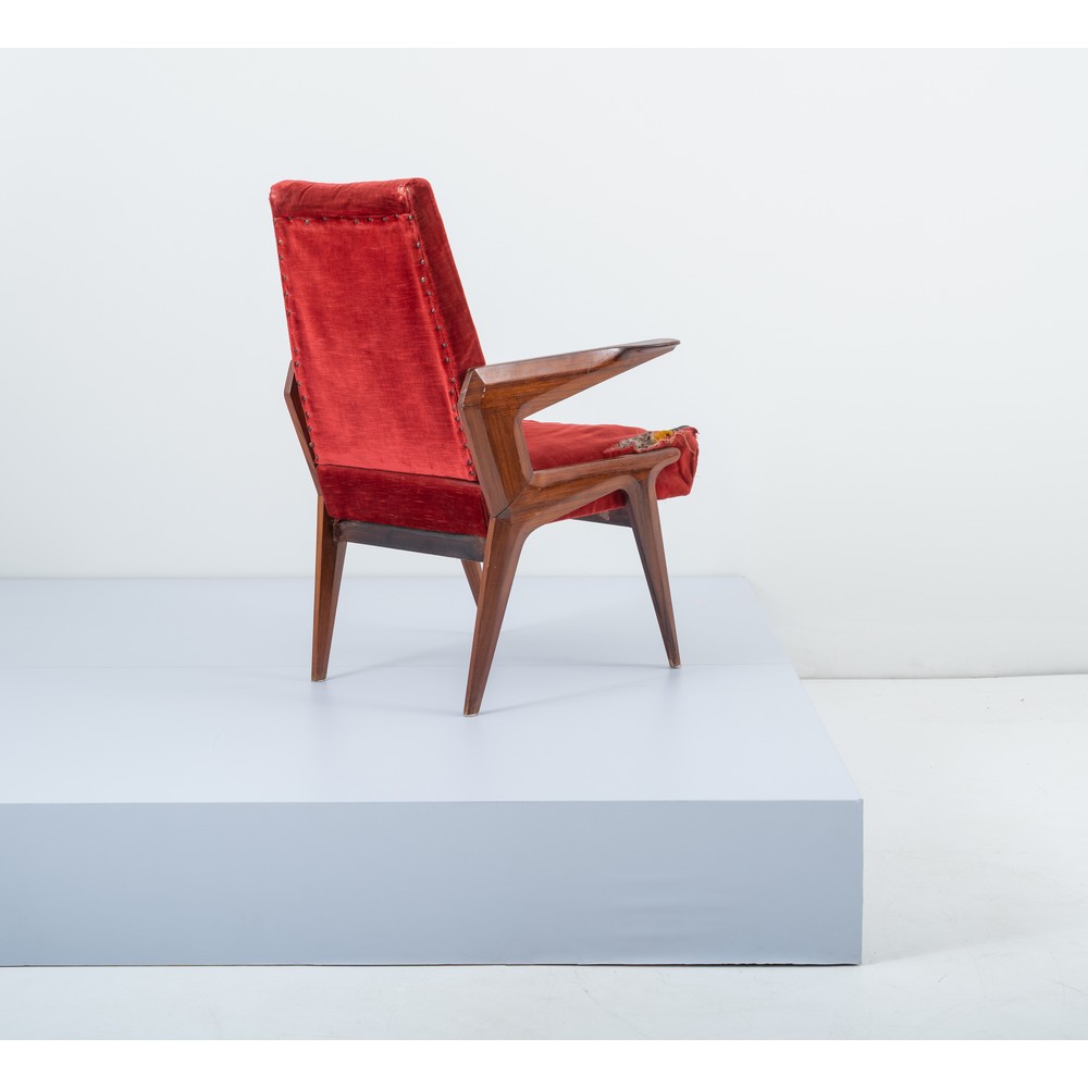 Poltrona con struttura in legno esotico, bracciolo sospeso, spalliera e seduta imbottite e rivestite con tessuto di velluto rosso. Usure al tessuto.