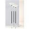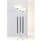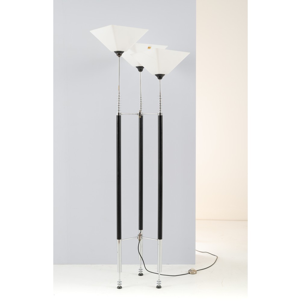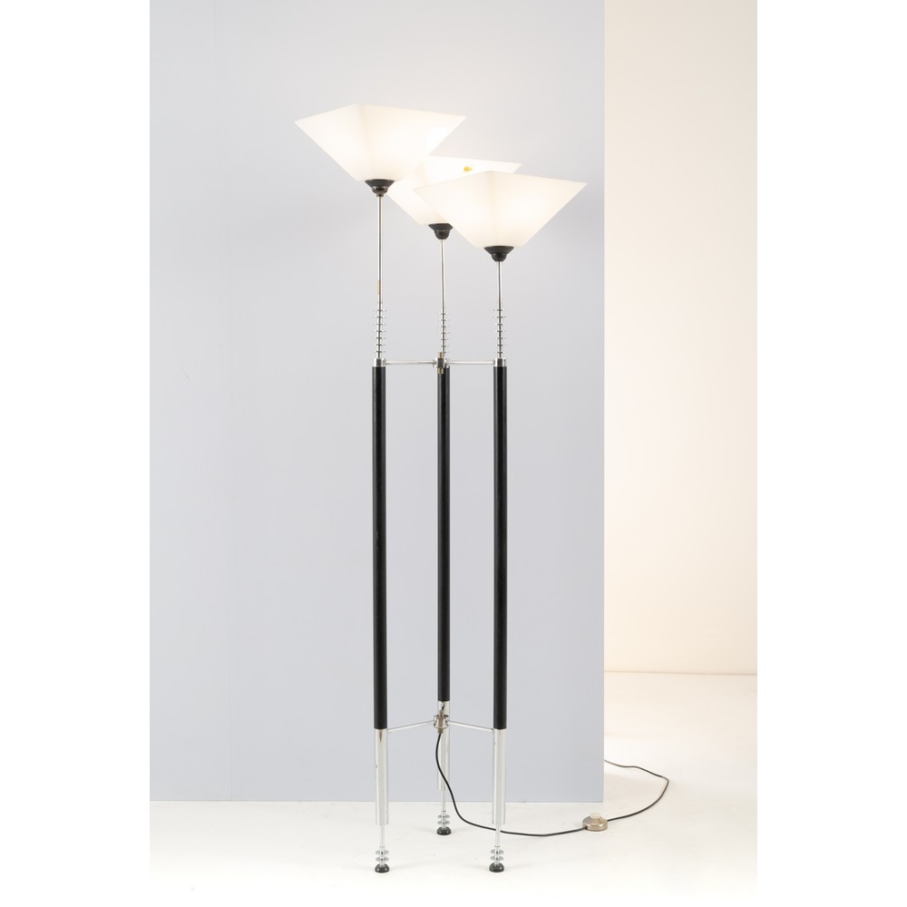 Lampada da terra a tre luci, struttura in tubolare cromato e in metallo verniciato, diffusori piramidali in metacrilato bianco.