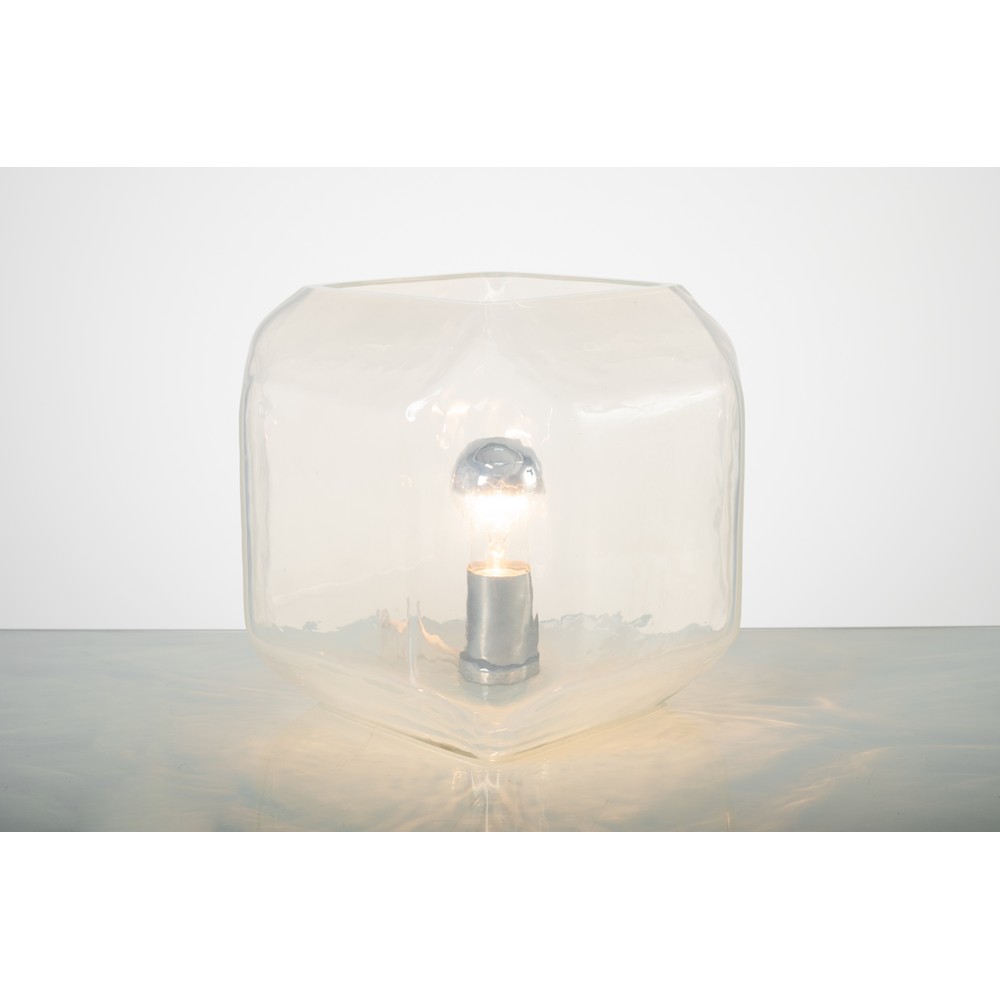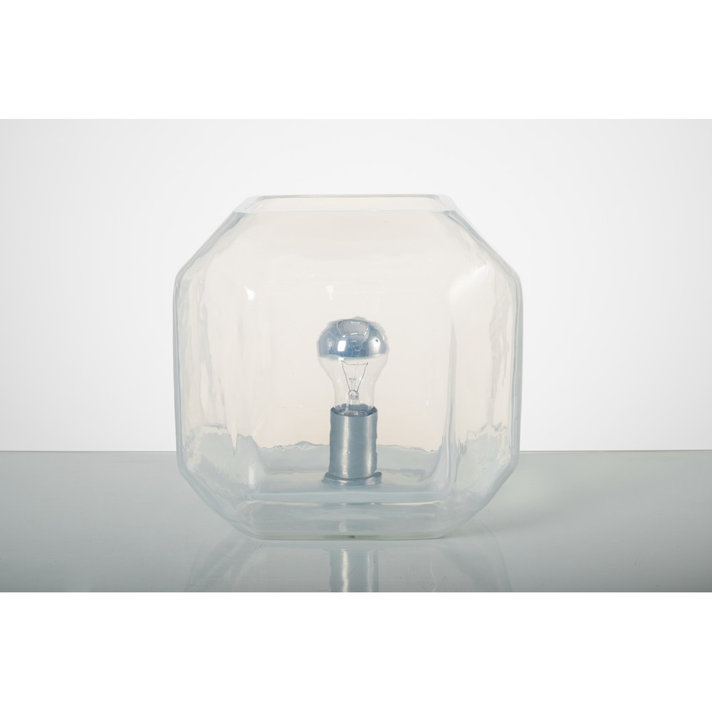 Lampada da tavolo ad una luce in vetro opalescente, corpo cubico con bordi superiori e inferiori inclinati.