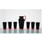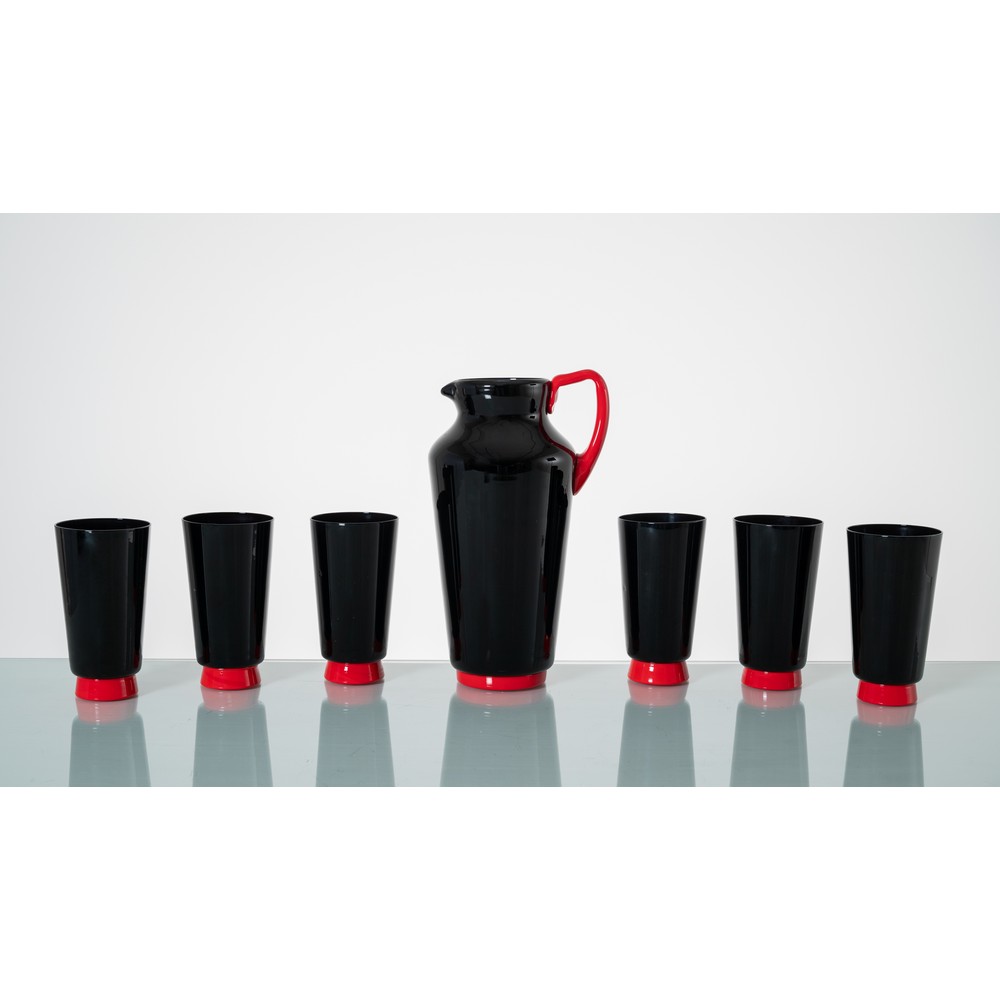 Sei bicchieri ed una caraffa in vetro nero e rosso. Etichetta di produzione alla base.